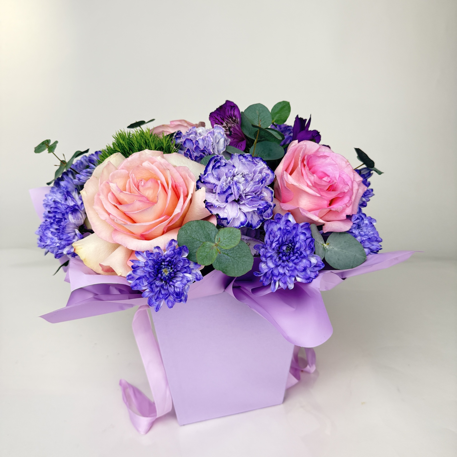 Состав: гвоздика 5, роза 3, хризантема кустовая 2, альстромерия 1, эвкалипт 0,1 и прочее. под заказ
