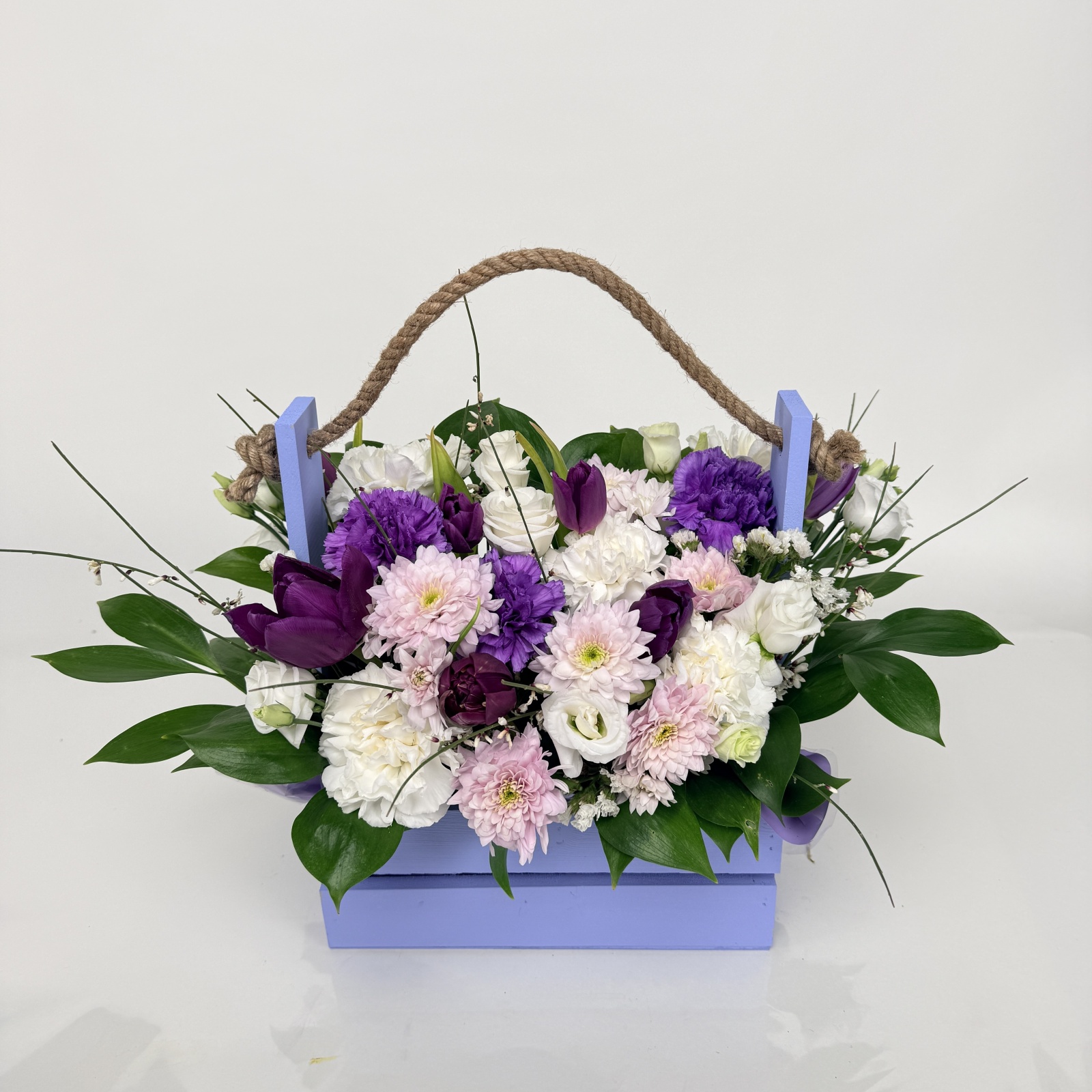 Состав: гвоздика 8, хризантема кустовая 2, тюльпан 1, рускус 0,3 и прочее. под заказ