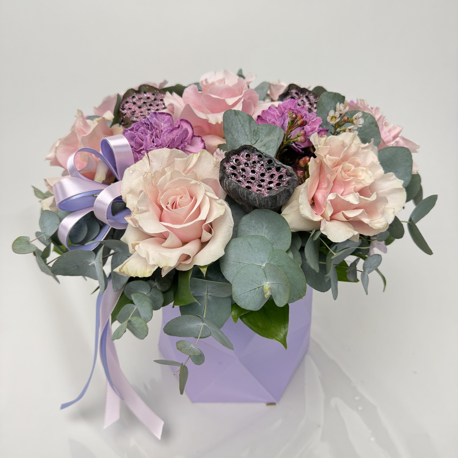 Состав: роза 8, гвоздика 6, эвкалипт 1 и прочее.