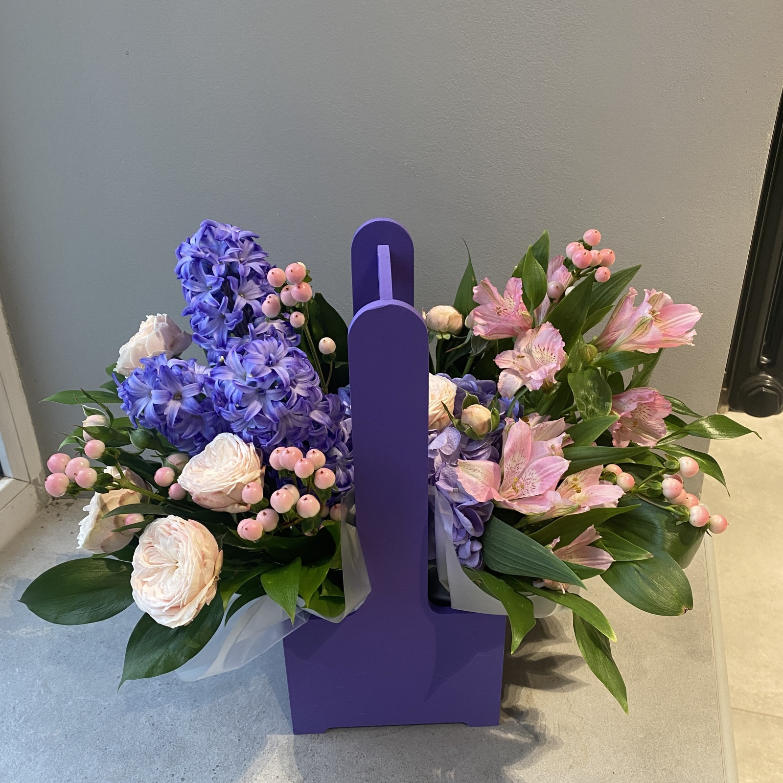 Состав: гиацинт 3, альстромерия 2, роза кустовая 1, гортензия 1, рускус 0,3 и прочее.