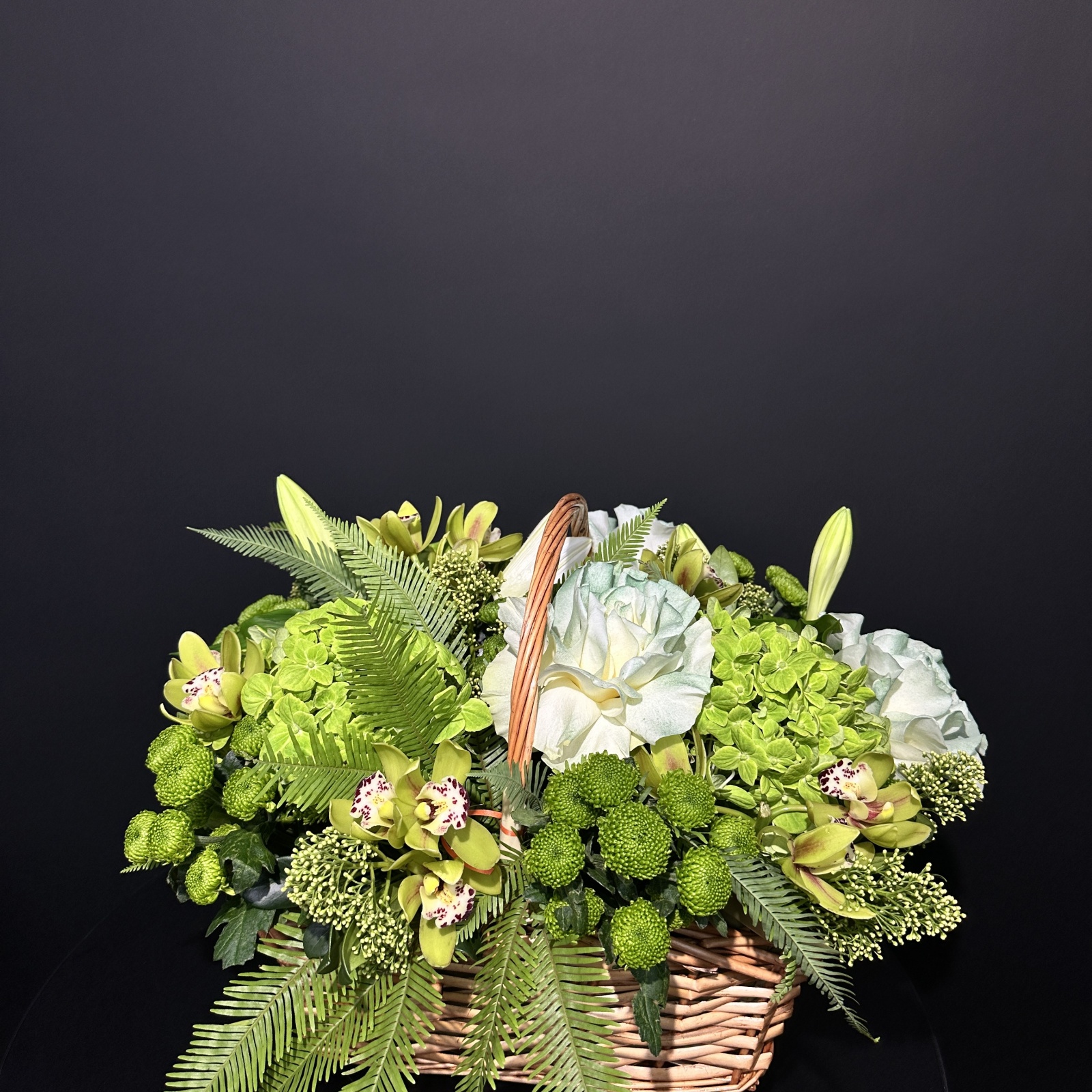 Состав: хризантема кустовая 4, гортензия 3, роза 3, лилия 2, ветка цимбидиум 1 и прочее.