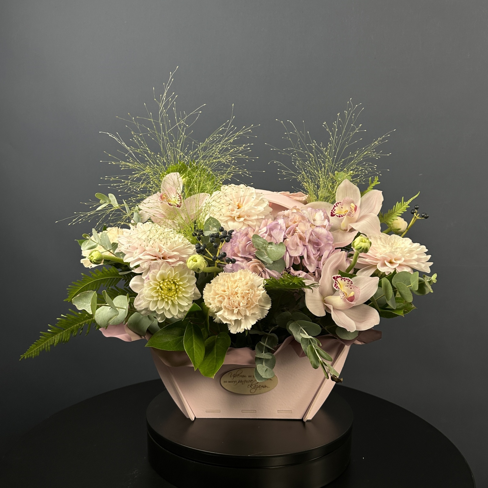 Состав: гвоздика 4, рускус 3, клематис 1, гортензия 1, роза 1, эвкалипт 1, ветка цимбидиум 0,2 и прочее.
