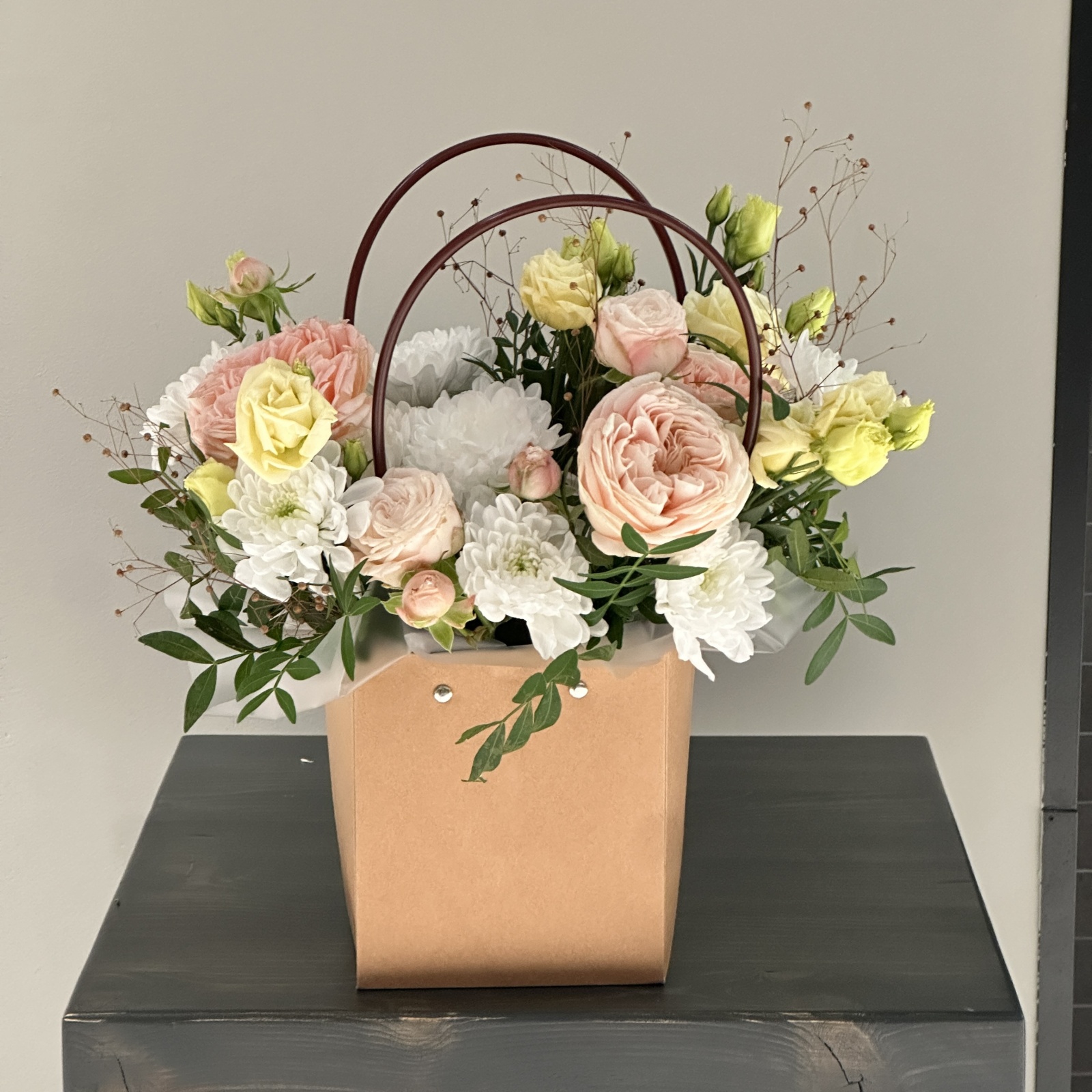 Состав: роза 3, роза кустовая 1, хризантема кустовая 1, фисташка 0,2 и прочее. в наличии