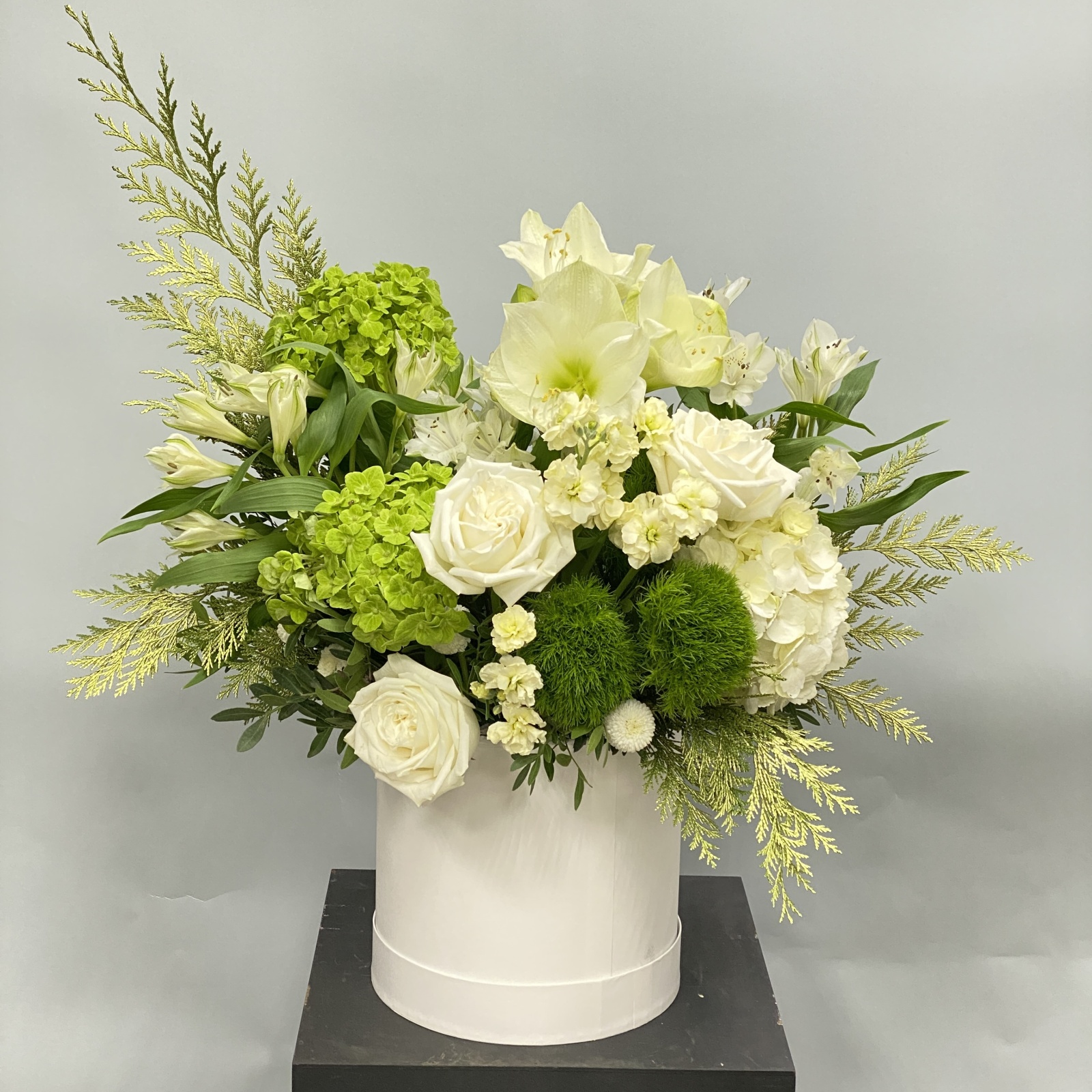 Состав: альстромерия 3, гвоздика 3, хризантема кустовая 3, гортензия 3, роза 3, маттиола 1, фисташка 1 и прочее.