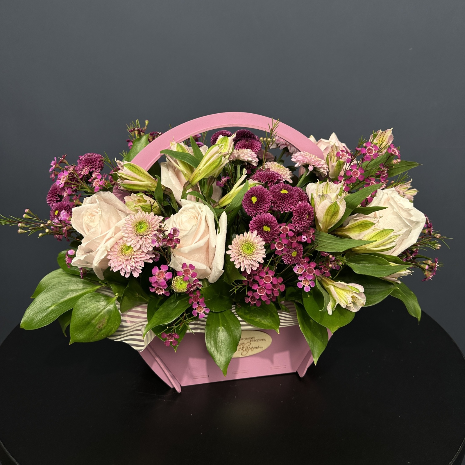 Состав: роза 5, альстромерия 3, хризантема 3, хамелациум 1, хризантема кустовая 1, рускус 0,2 и прочее.