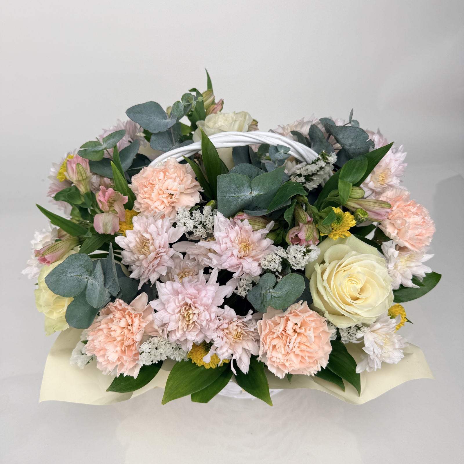 Состав: гвоздика 5, хризантема кустовая 3, роза 3, альстромерия 3, статица 1 и прочее. под заказ