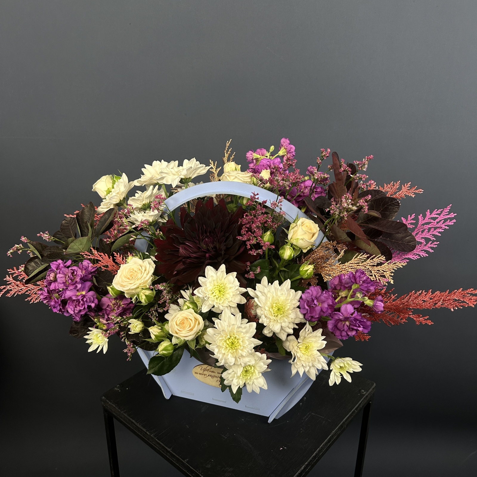 Состав: хризантема кустовая 3, лимониум 2, маттиола 1, роза кустовая 0,5 и прочее.