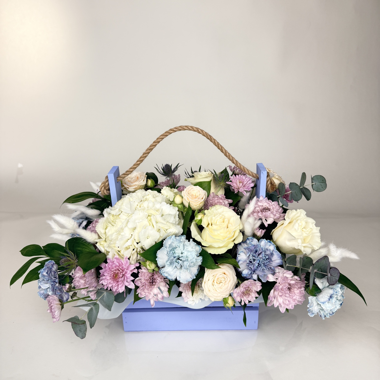 Состав: гвоздика 4, роза 3, роза кустовая 1, гортензия 1, рускус 1, эрингиум 1 и прочее.
