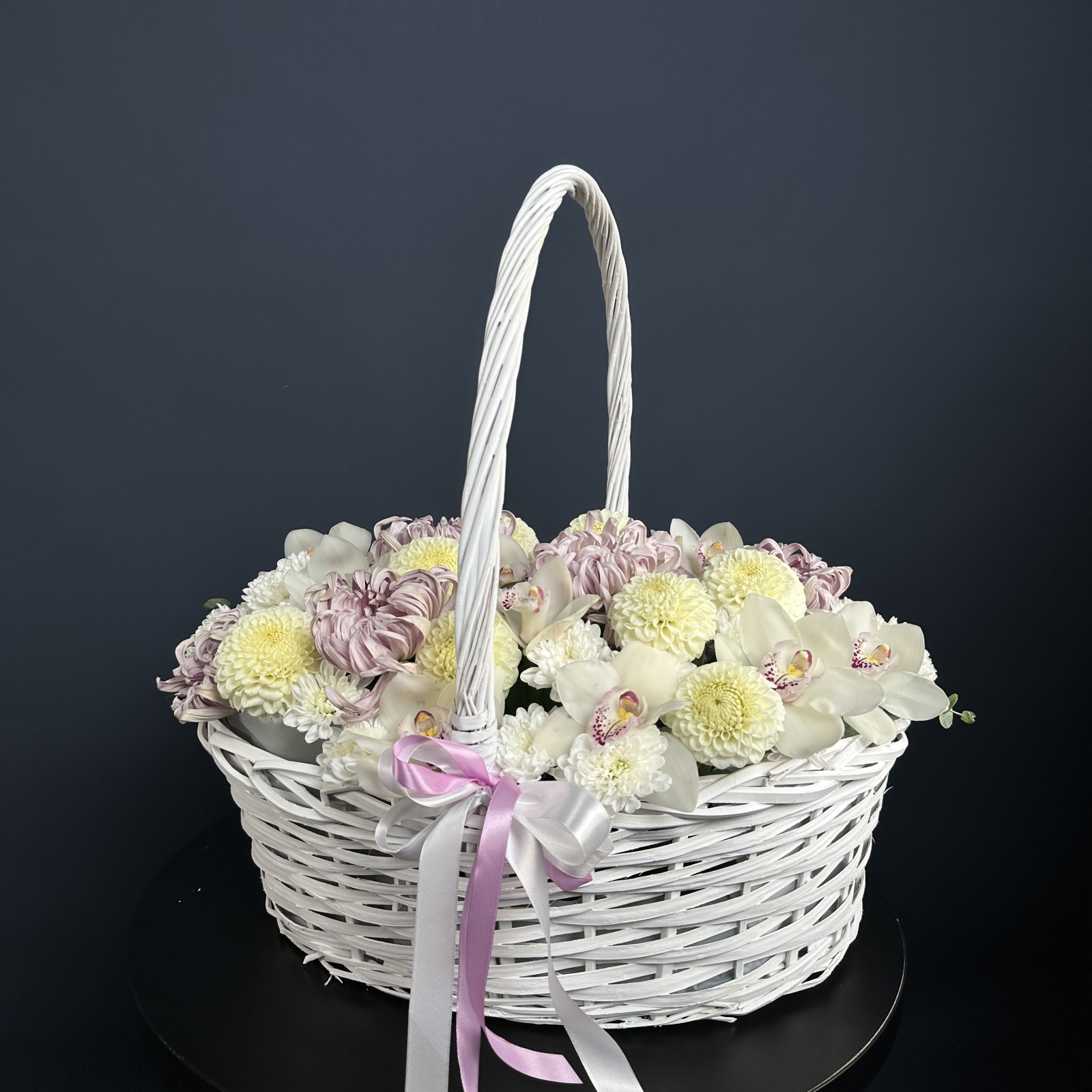 Состав: хризантема 5, хризантема кустовая 5, эвкалипт 3, гортензия 1, ветка цимбидиум 0,7 и прочее. под заказ