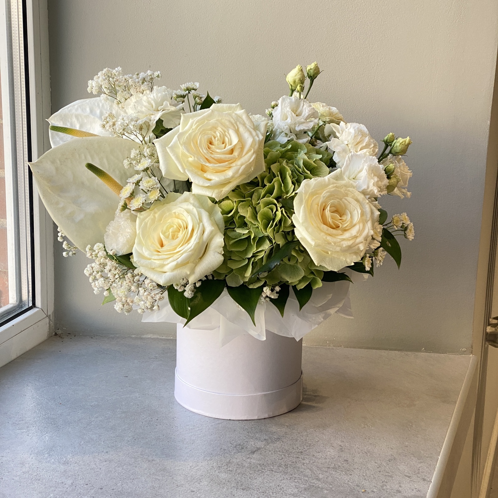 Состав: хризантема 3, роза 3, гвоздика 2, роза кустовая 1, гортензия 1, лизиантус 1, рускус 0,5 и прочее. под заказ