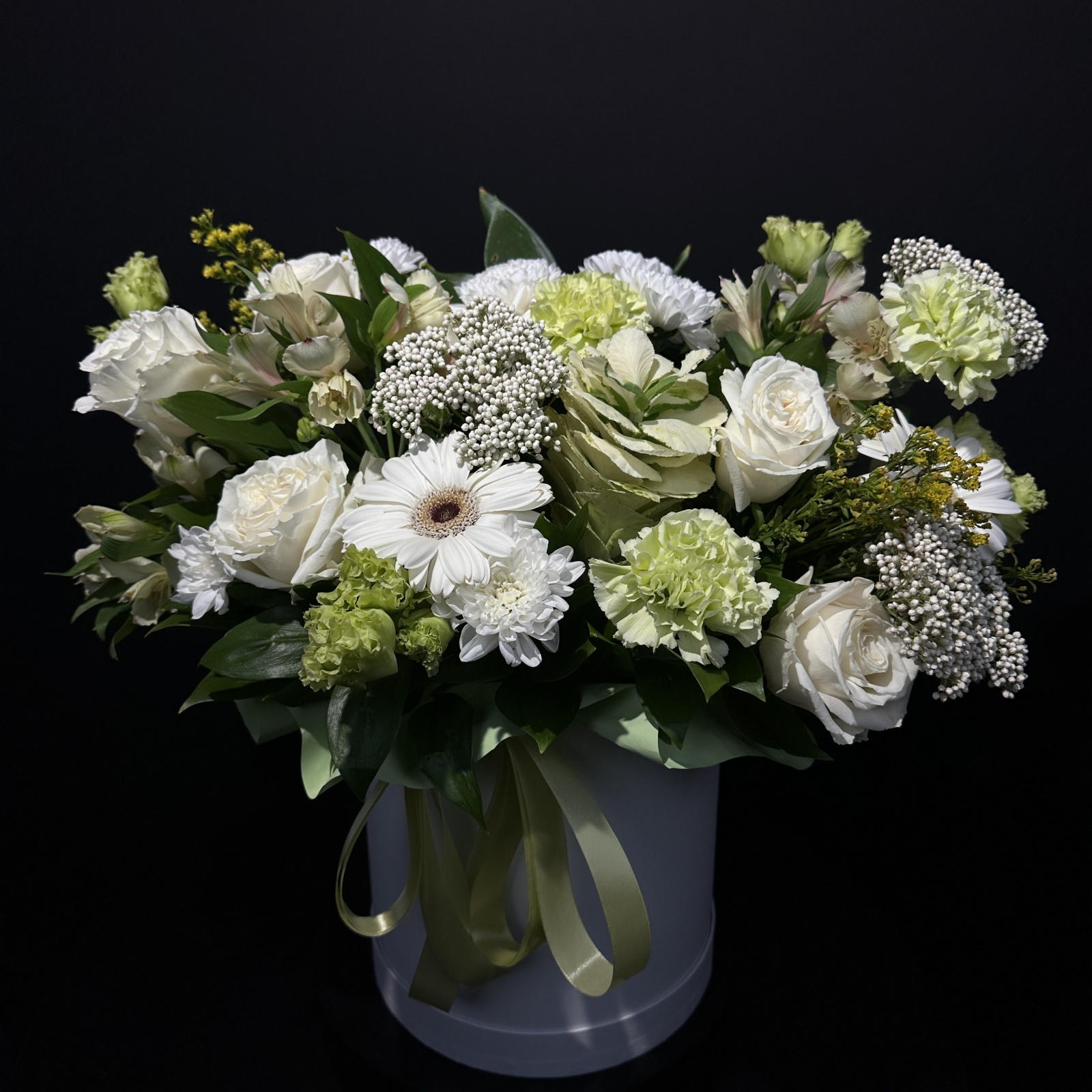 Состав: роза 5, гербера 5, солидаго 3, альстромерия 3, гвоздика 3, хризантема кустовая 2, лизиантус 1, рускус 0,5 и прочее.