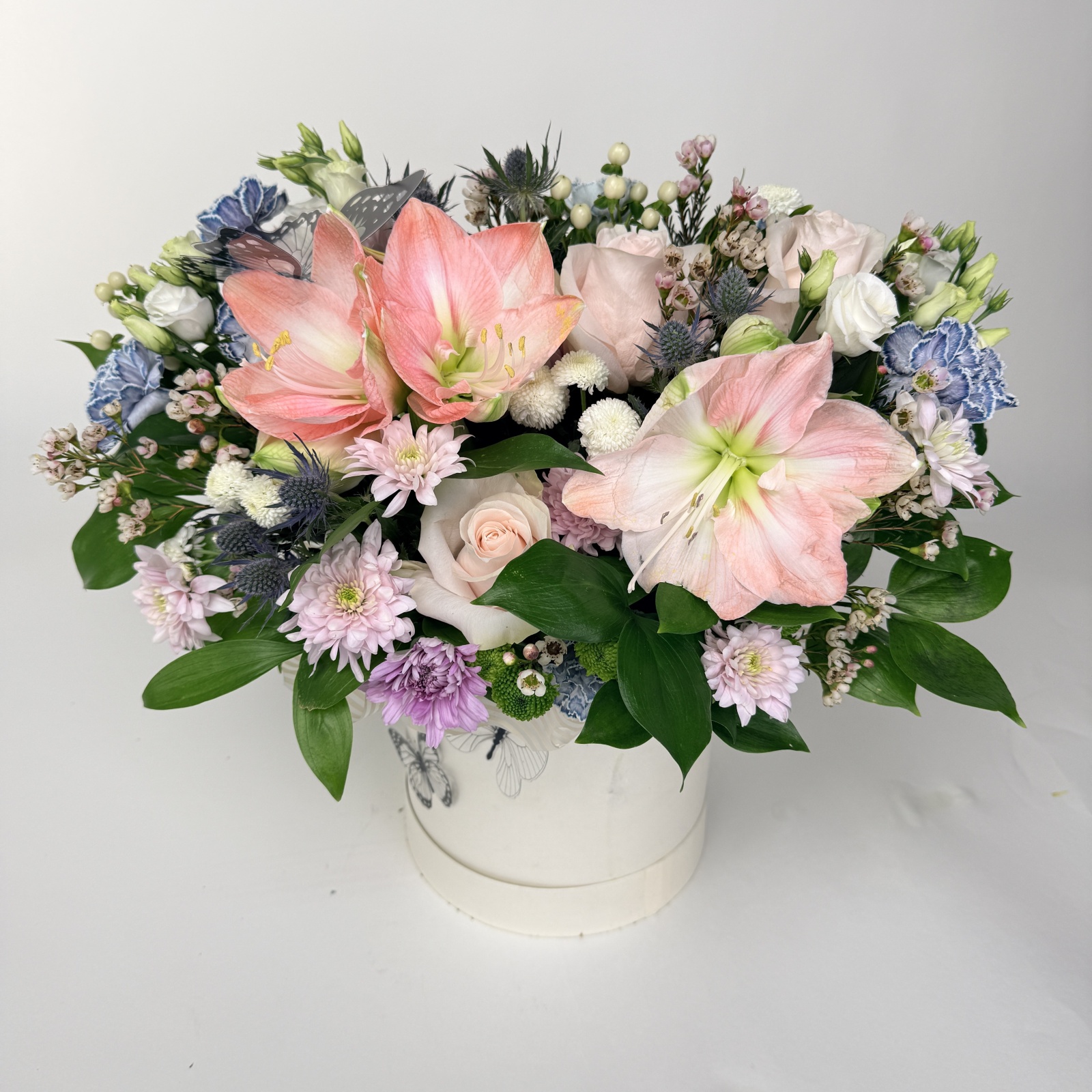 Состав: гвоздика 8, роза 3, эрингиум 3, гиперикум 2, рускус 1, лизиантус 1, хризантема кустовая 1 и прочее. под заказ