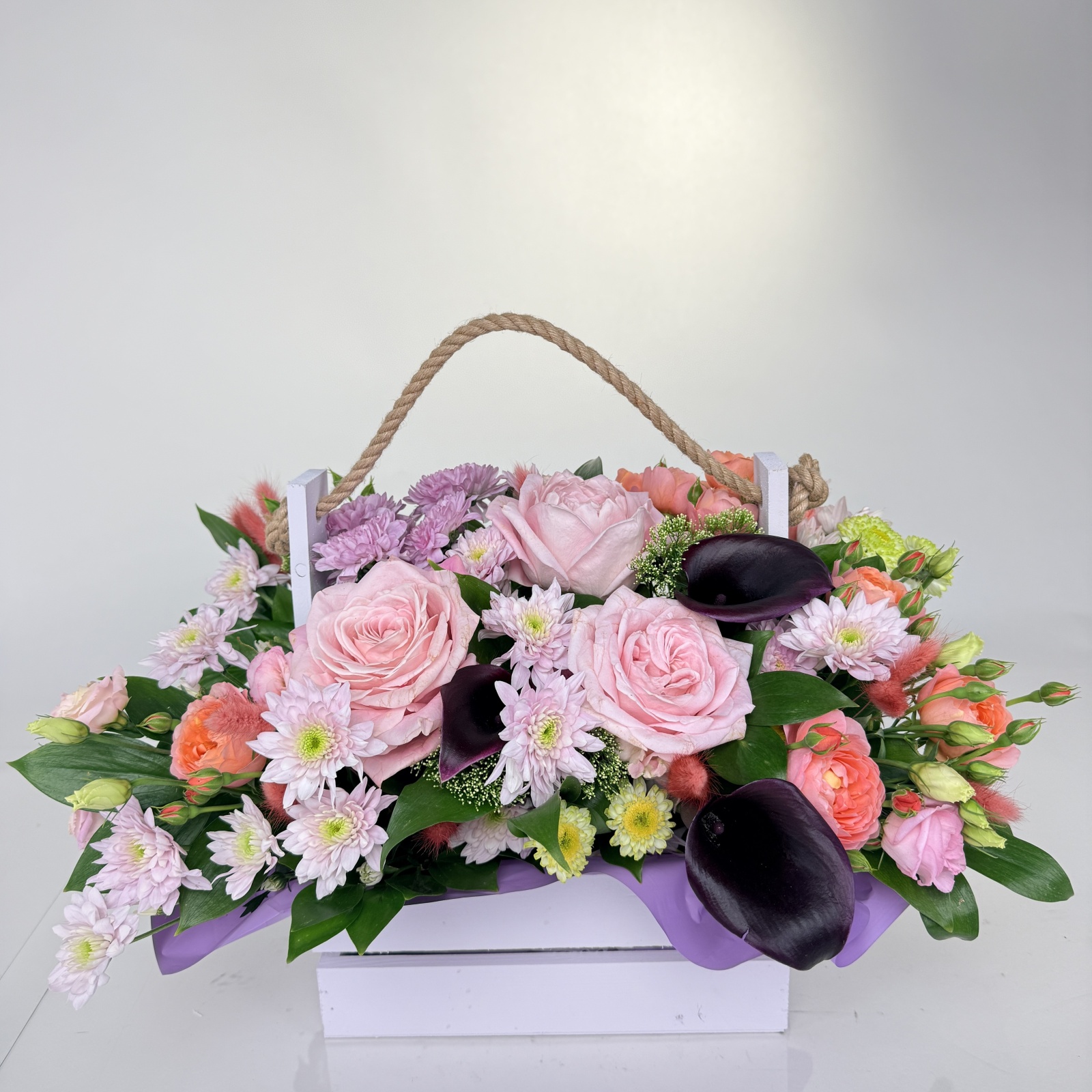 Состав: роза 3, гвоздика 2, хризантема кустовая 2, роза кустовая 1, рускус 0,5 и прочее. под заказ