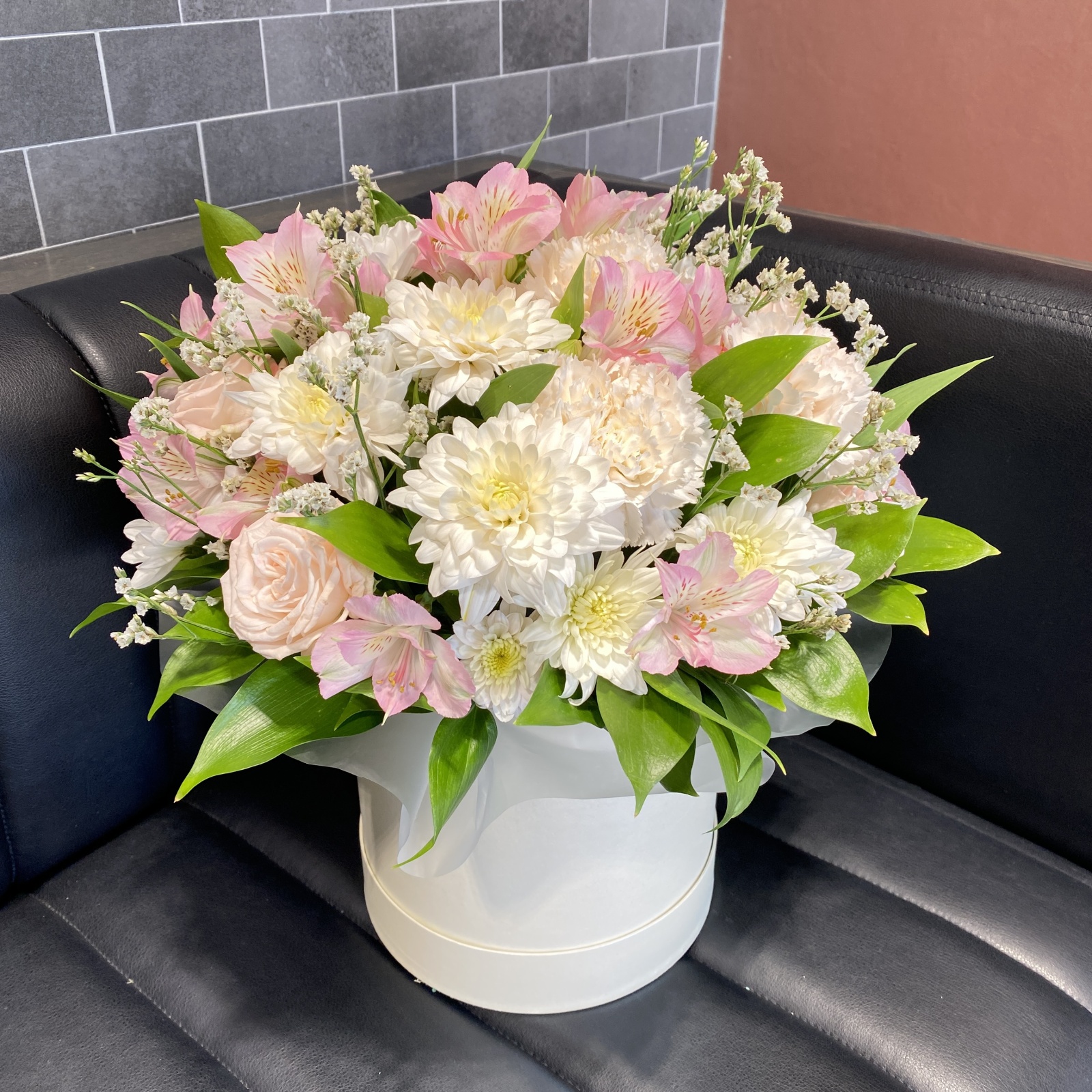 Состав: альстромерия 4, гвоздика 3, роза кустовая 1, хризантема кустовая 1, рускус 0,5 и прочее. под заказ