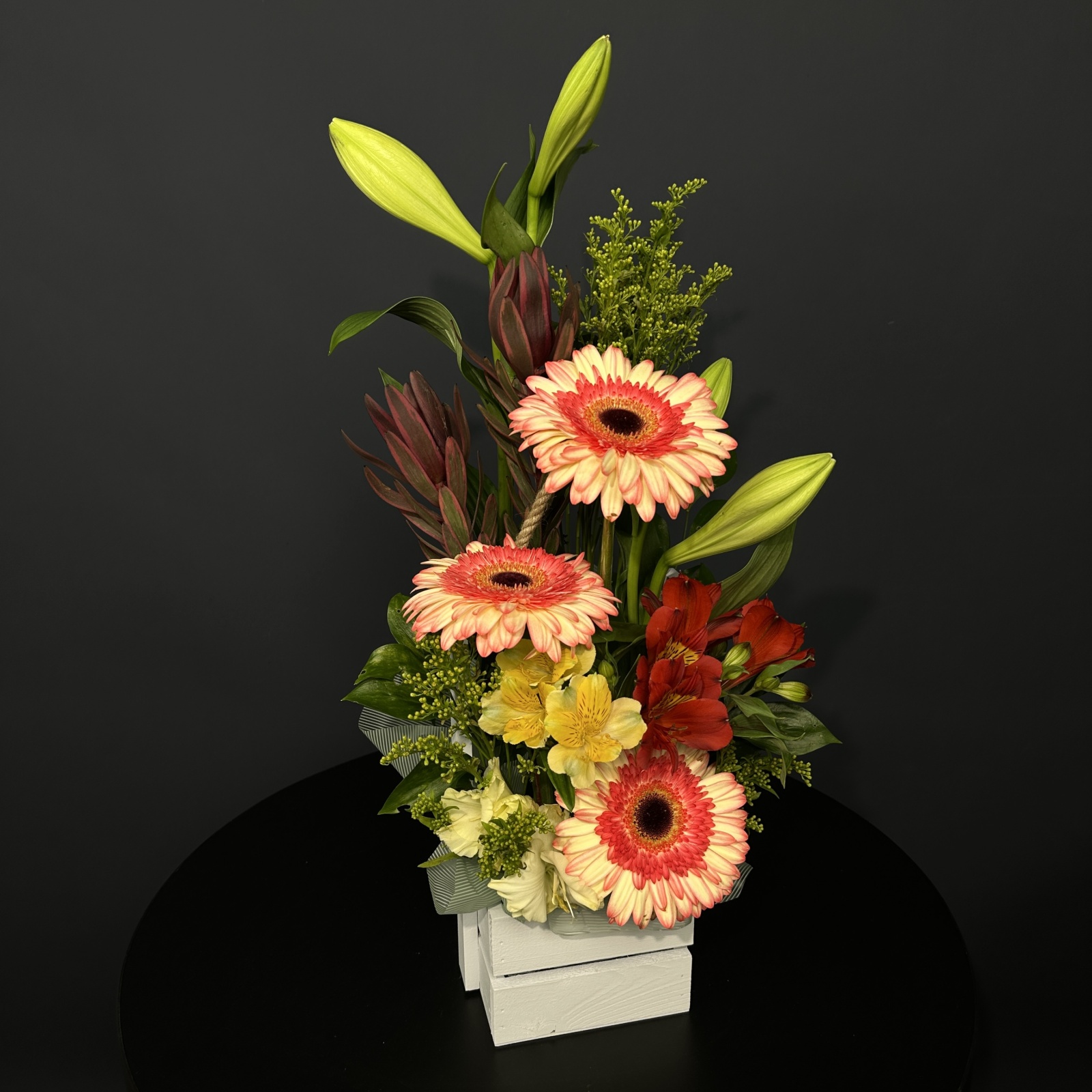 Состав: гербера 3, альстромерия 2, леукадендрон 2, лилия 2, солидаго 2, гладиолус 1, рускус 0,1 и прочее. под заказ