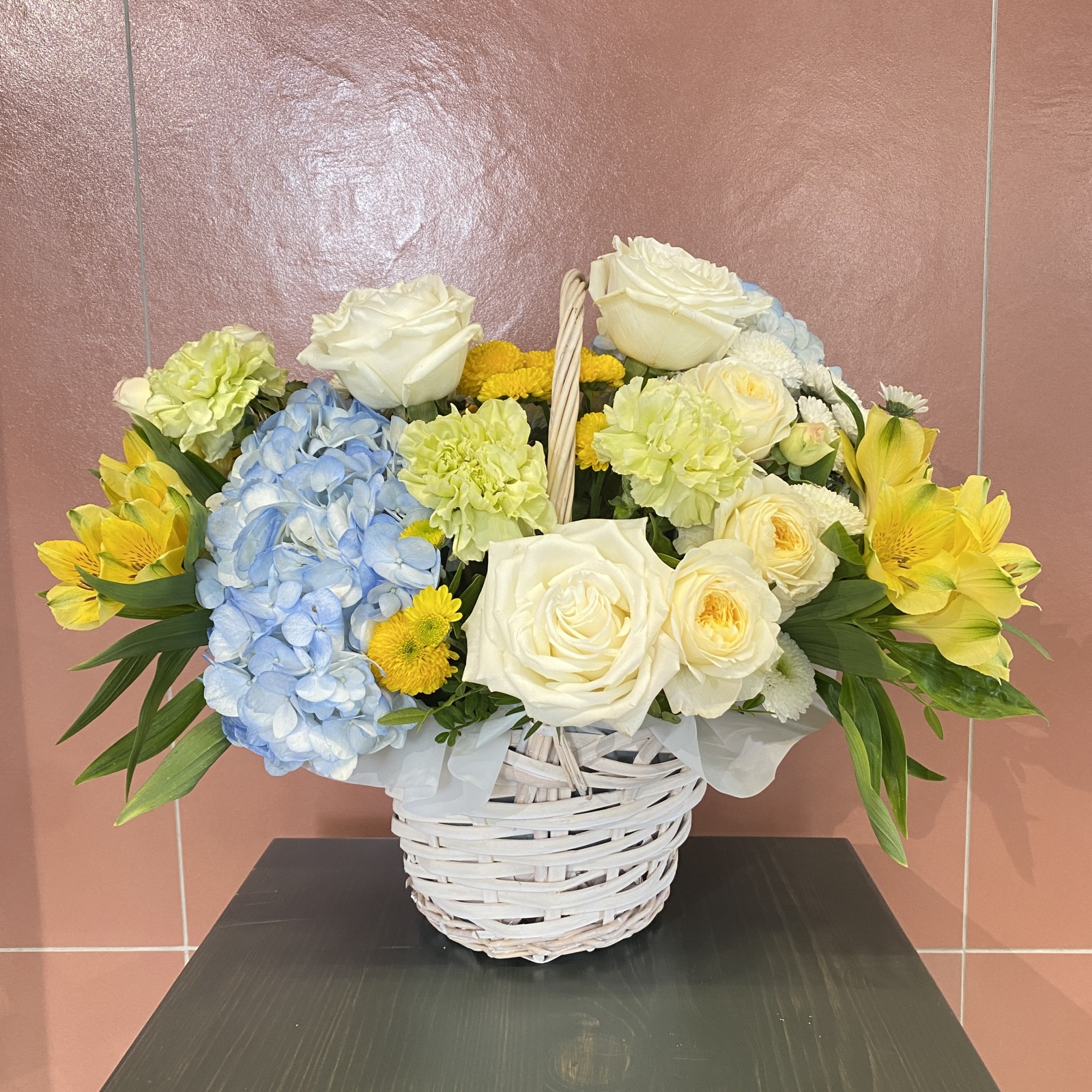 Состав: хризантема кустовая 4, роза 3, альстромерия 3, гвоздика 3, гортензия 2, роза кустовая 1, фисташка 0,2 и прочее.