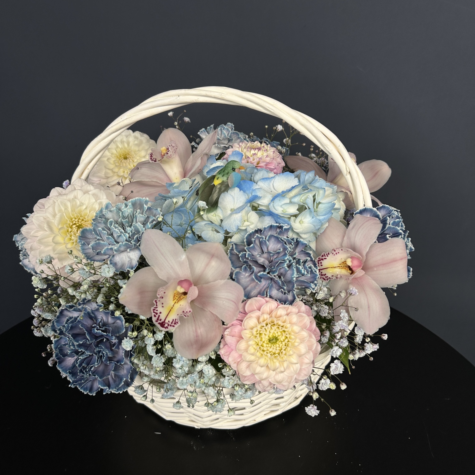 Состав: гвоздика 9, гвоздика кустовая 3, гортензия 1, роза кустовая 1, рускус 0,5 и прочее. под заказ