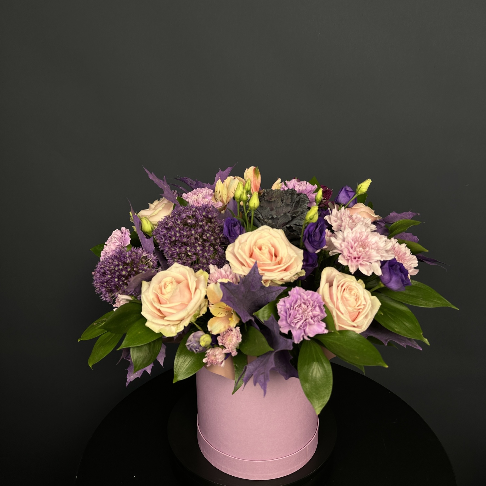 Состав: роза 5, гвоздика 5, альстромерия 2, лизиантус 2, хризантема кустовая 1 и прочее.