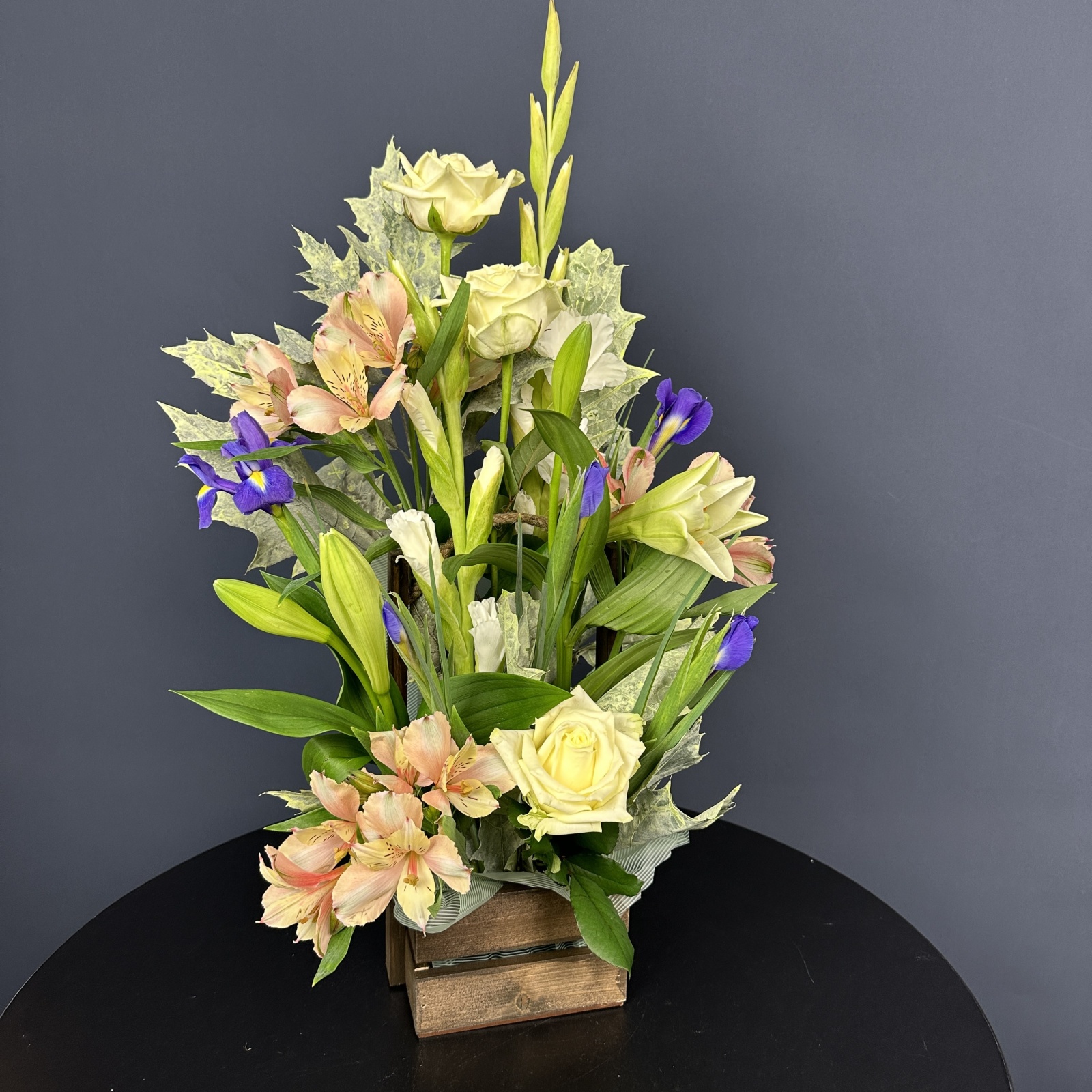 Состав: ирис 4, роза 3, альстромерия 3, гладиолус 2, лилия 2, гвоздика 1 и прочее.