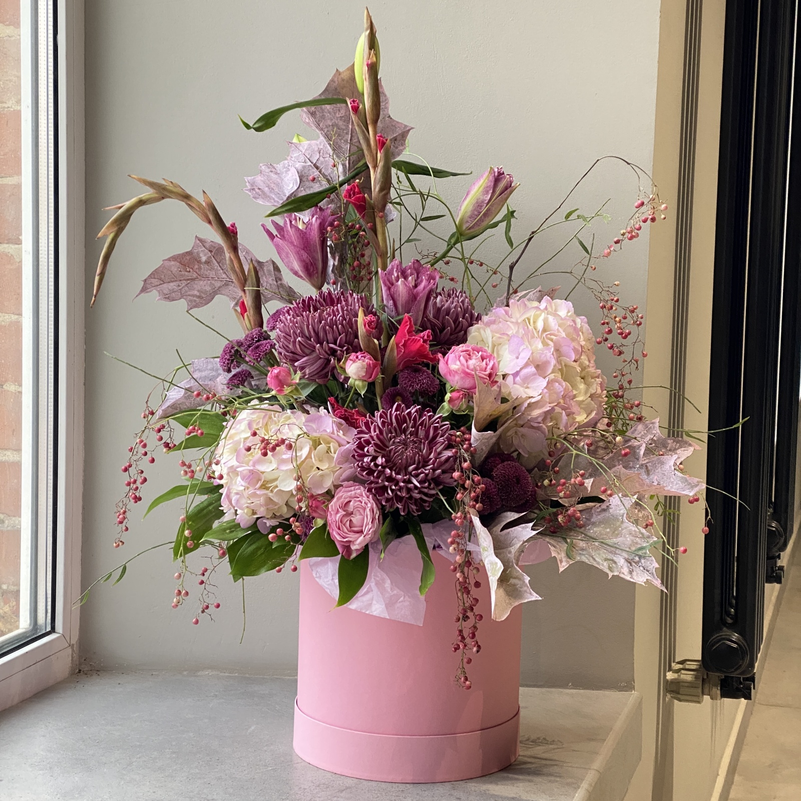 Состав: хризантема 8, гладиолус 3, гортензия 2, лилия 1, роза кустовая 1 и прочее.