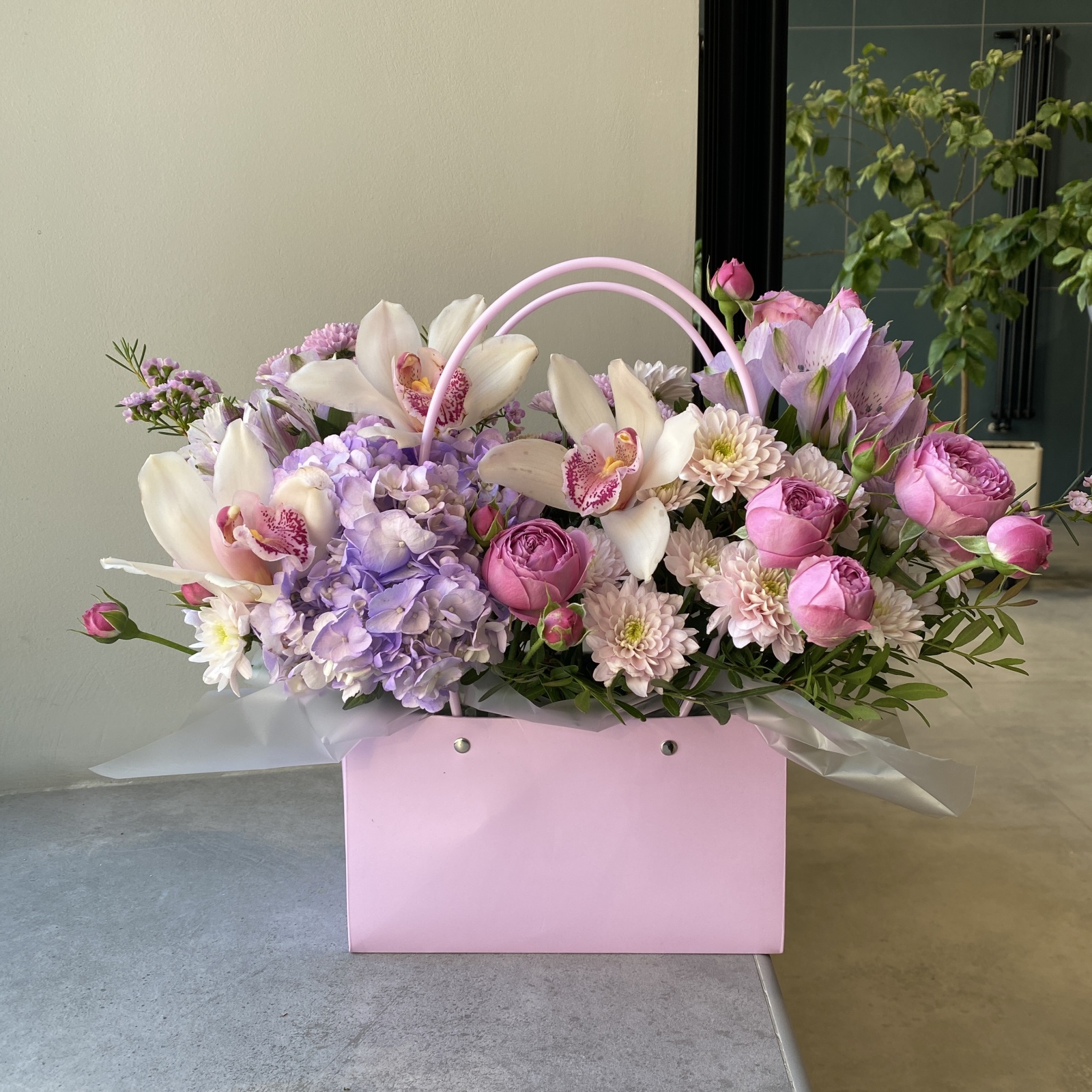 Состав: хризантема 2, альстромерия 2, роза кустовая 1, гортензия 1, ветка цимбидиум 0,3, фисташка 0,3 и прочее.
