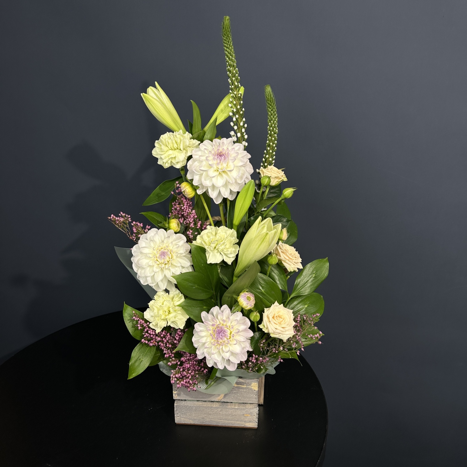 Состав: гвоздика 3, лизимахия 2, лилия 2, роза кустовая 0,5, рускус 0,25 и прочее.