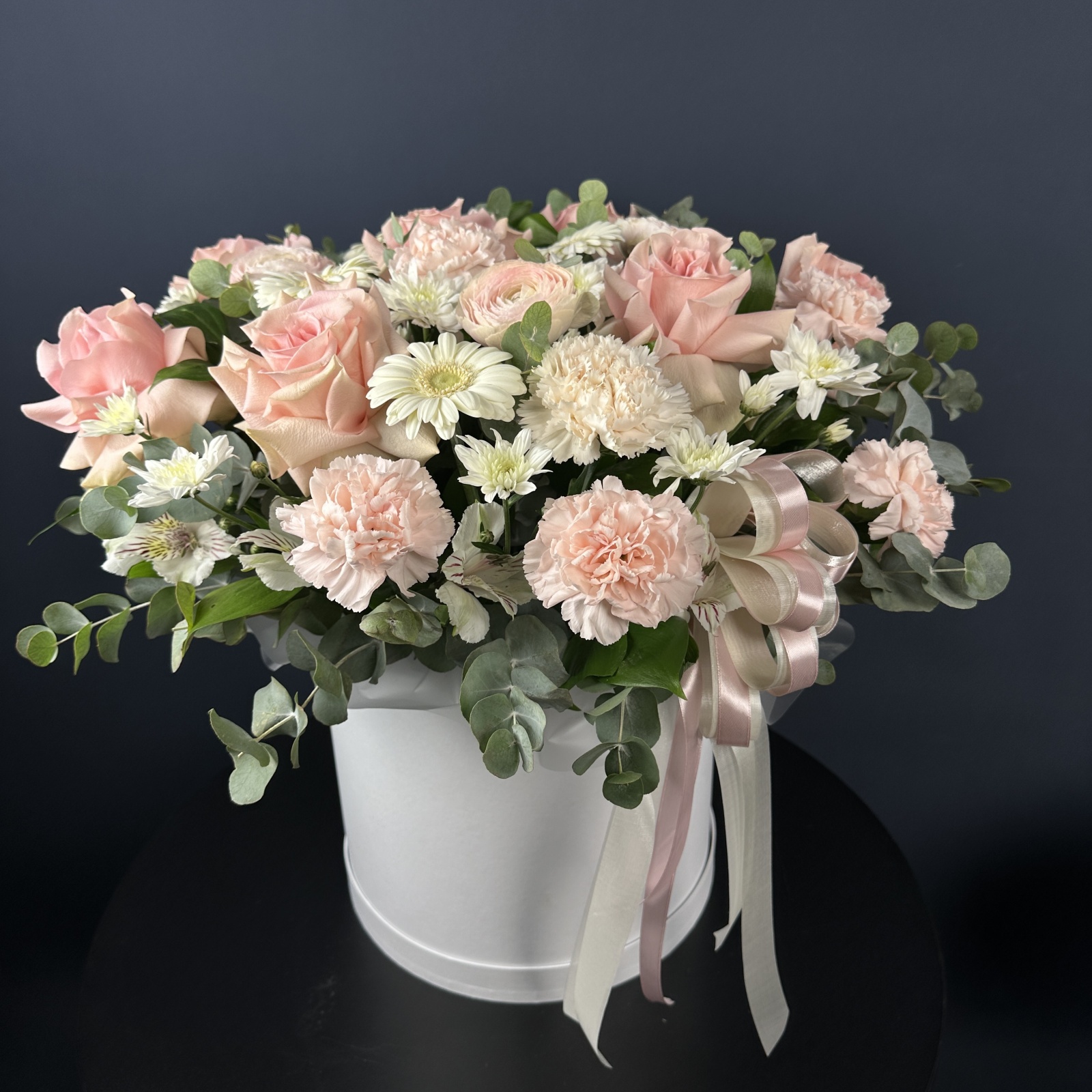 Состав: гвоздика 8, роза 6, эвкалипт 6, гербера 5, ранункулюс 3, альстромерия 1 и прочее. под заказ