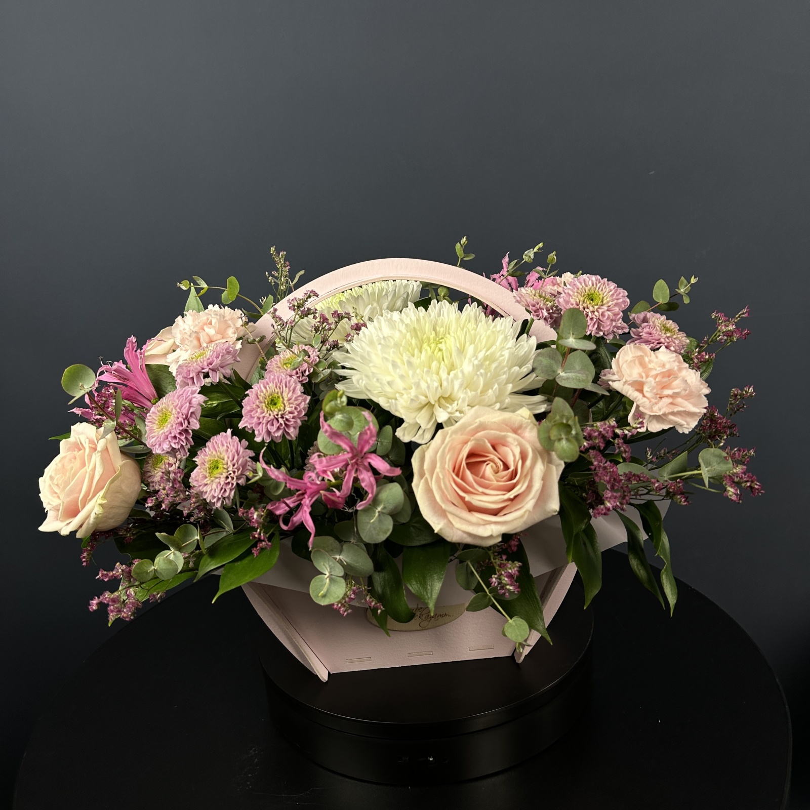 Состав: гвоздика 3, лимониум 3, роза 2, хризантема кустовая 2, хризантема 2, эвкалипт 1 и прочее. под заказ