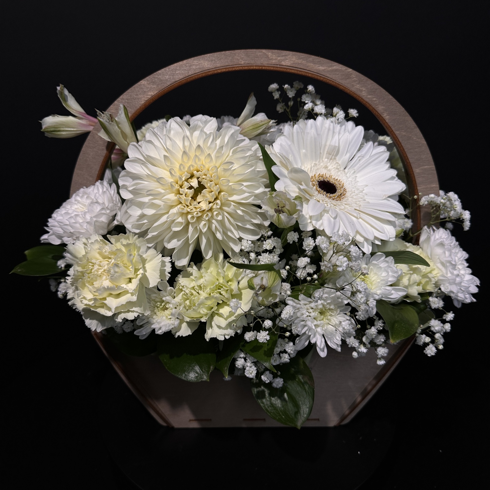 Состав: гвоздика 5, хризантема кустовая 2, роза 2, альстромерия 2, гипсофила 1, гербера 1, рускус 0,4 и прочее. под заказ