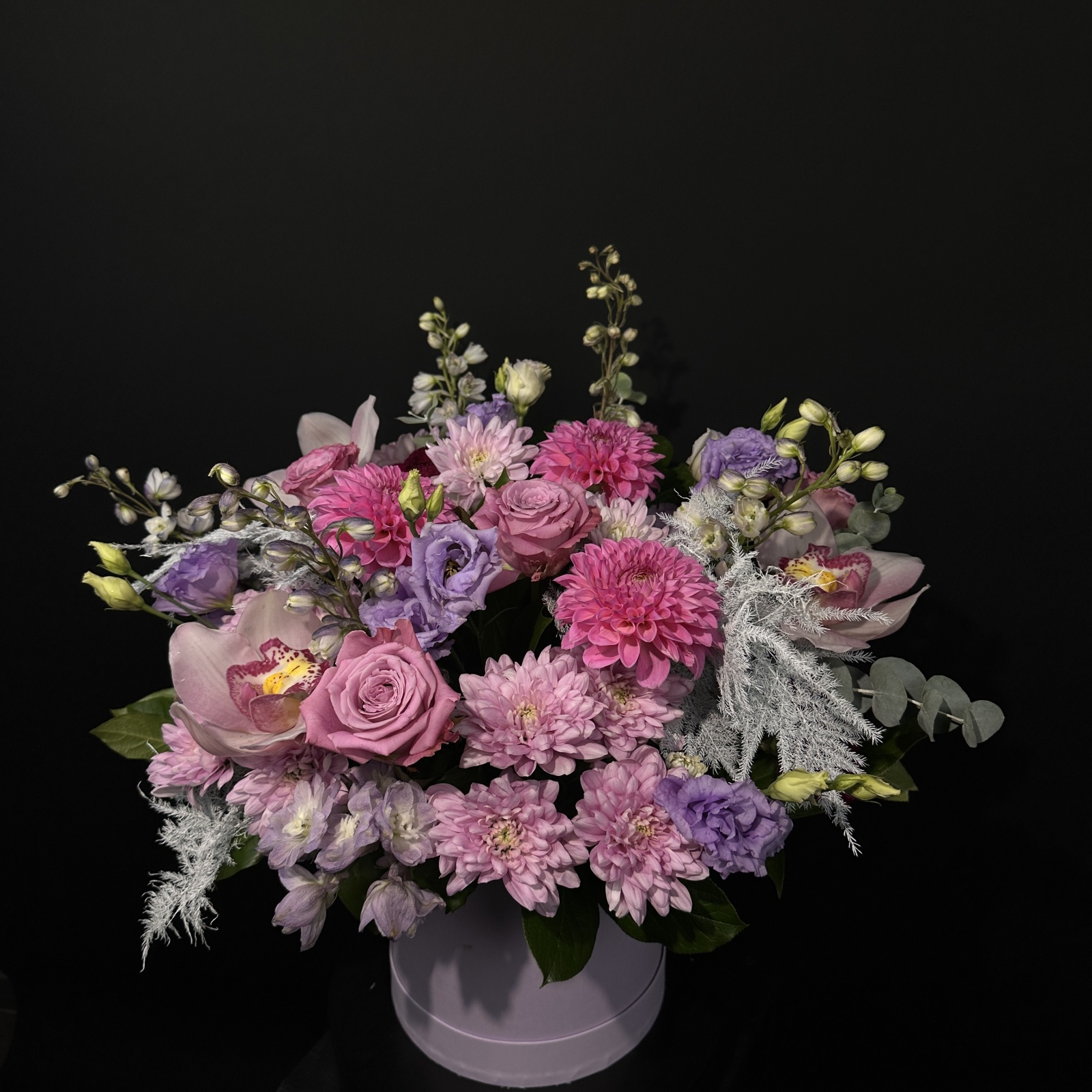 Состав: роза 5, гвоздика 5, дельфиниум 3, лизиантус 2, хризантема кустовая 2, рускус 0,5, ветка цимбидиум 0,2 и прочее. под заказ