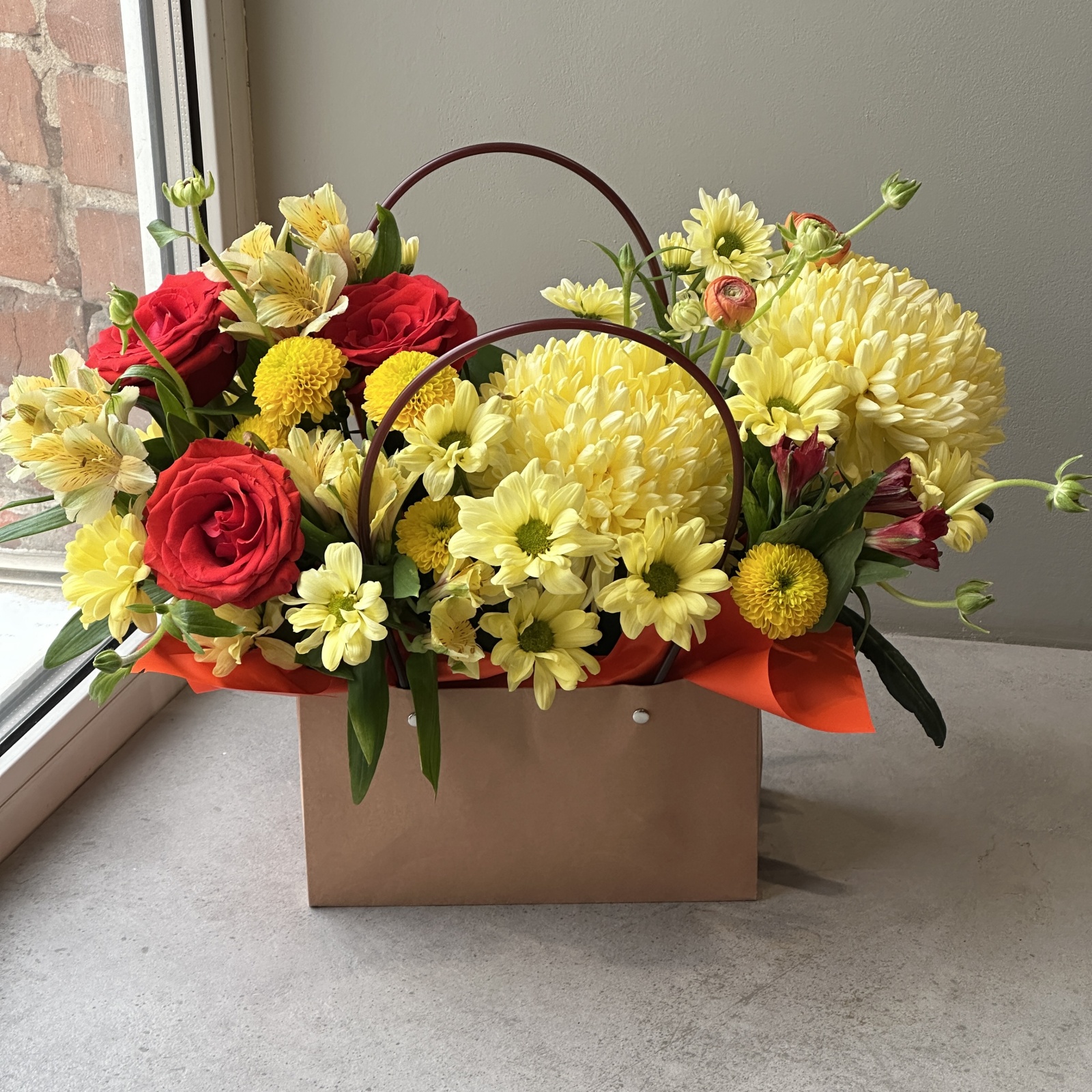 Состав: альстромерия 4, хризантема кустовая 3, роза 3, хризантема 2, рускус 1 и прочее. под заказ