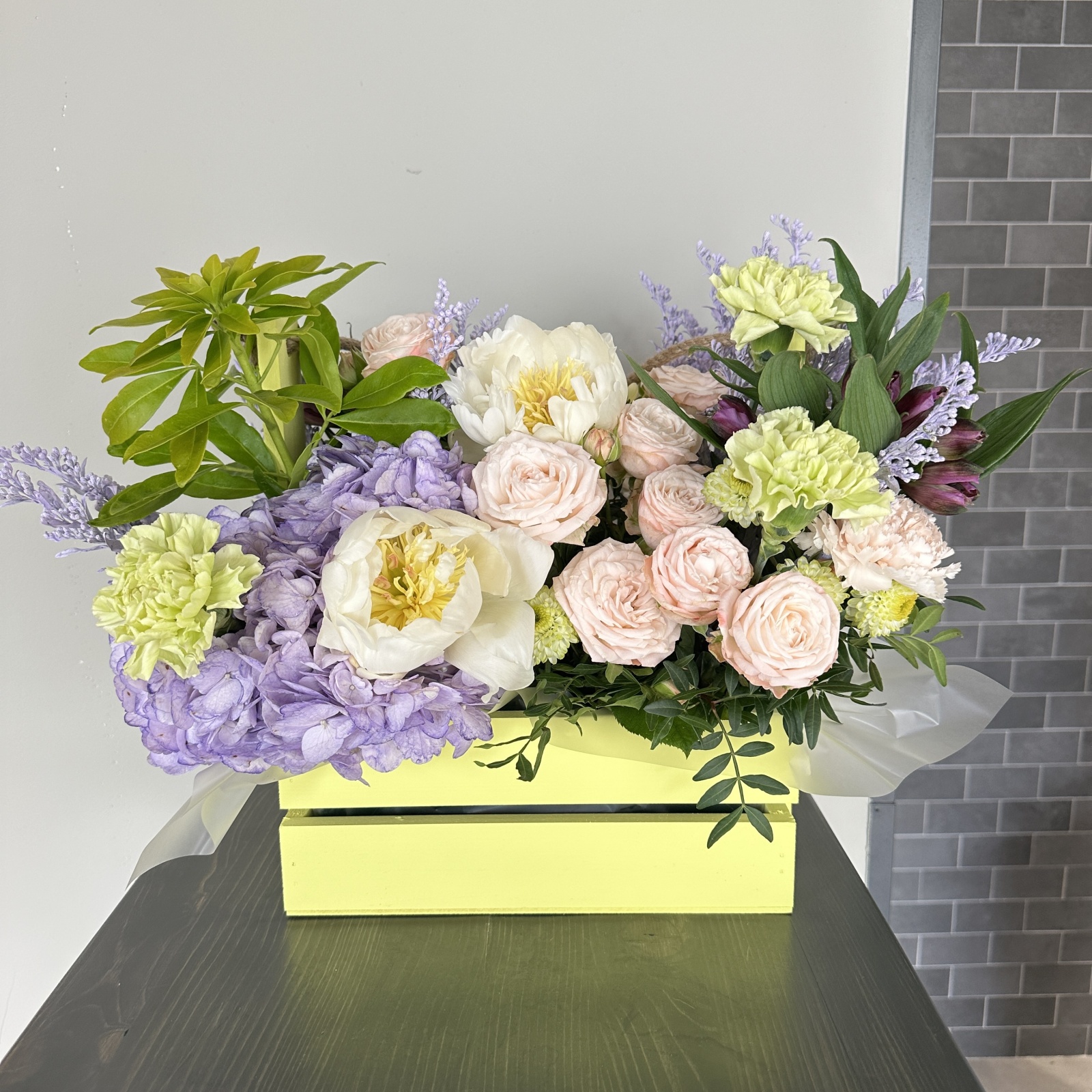 Состав: гвоздика 7, пион 2, альстромерия 2, чоисия 1, солидаго 1, роза кустовая 1, гортензия 1, фисташка 0,5 и прочее. под заказ
