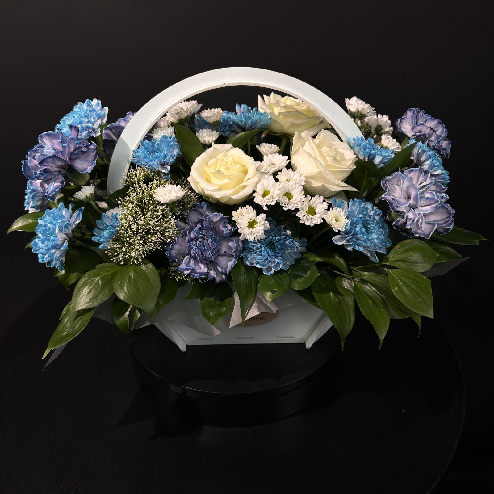 Состав: гвоздика 5, хризантема 3, роза 3, хризантема кустовая 1, рускус 0,5 и прочее. под заказ