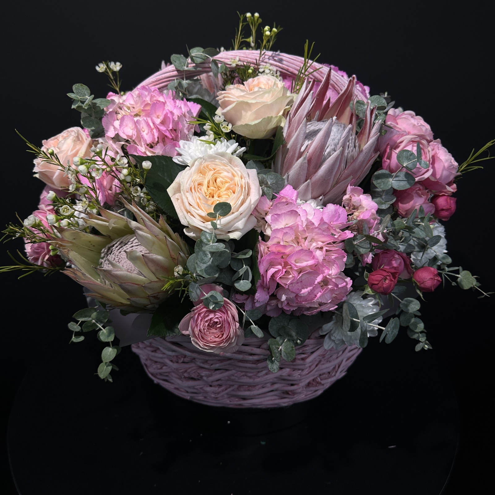 Состав: роза 4, роза кустовая 3, хризантема кустовая 3, эвкалипт 3, хамелациум 2 и прочее. под заказ