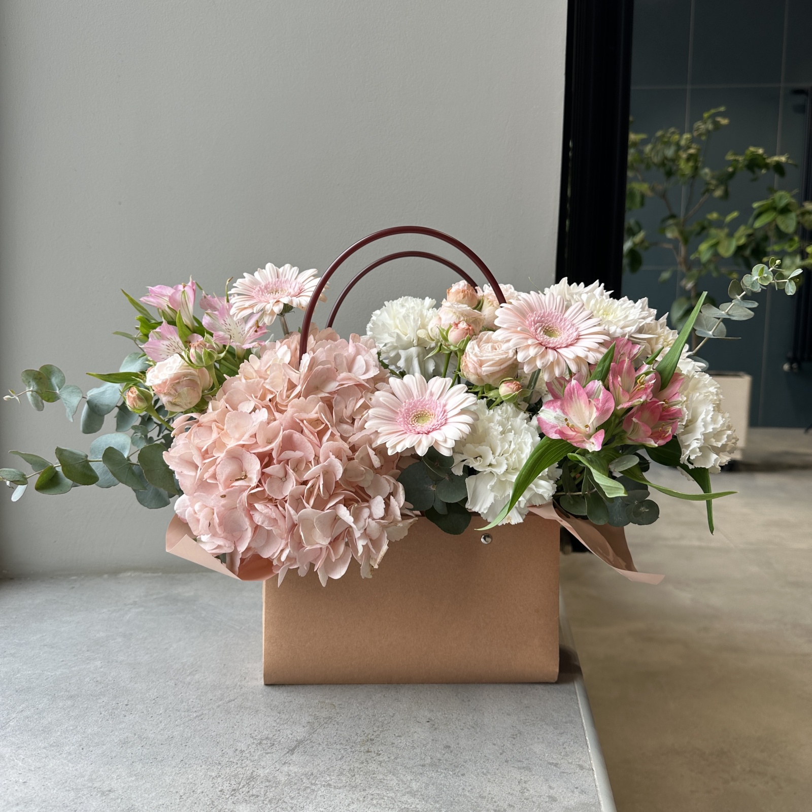 Состав: гвоздика 3, гербера 3, альстромерия 2, эвкалипт 1, гортензия 1, роза кустовая 1, хризантема кустовая 1, фисташка 0,3 и прочее. в наличии