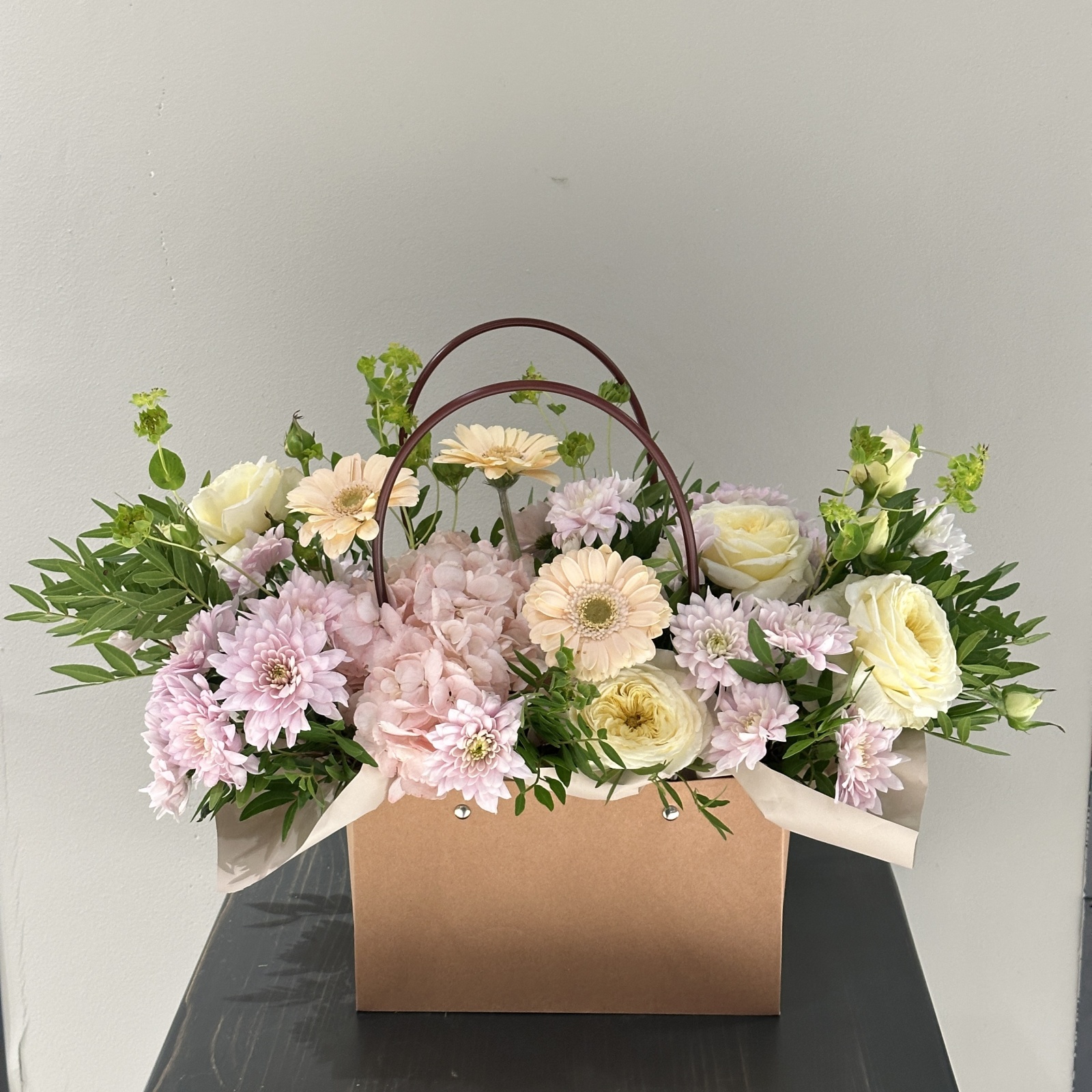 Состав: гербера 3, хризантема кустовая 2, роза кустовая 1, гортензия 1, фисташка 0,3 и прочее. под заказ