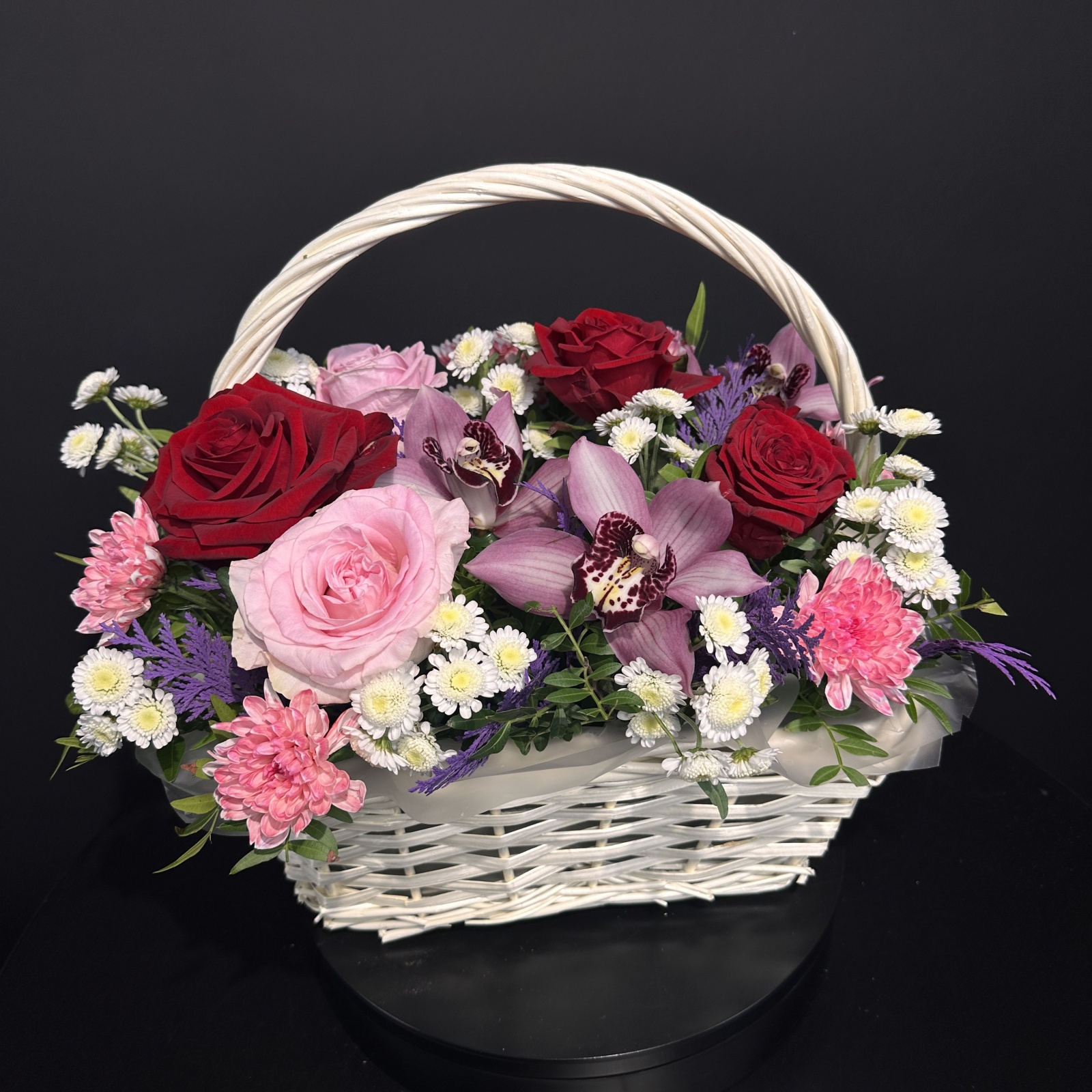 Состав: роза 5, хризантема кустовая 2, фисташка 0,3, ветка цимбидиум 0,2 и прочее.