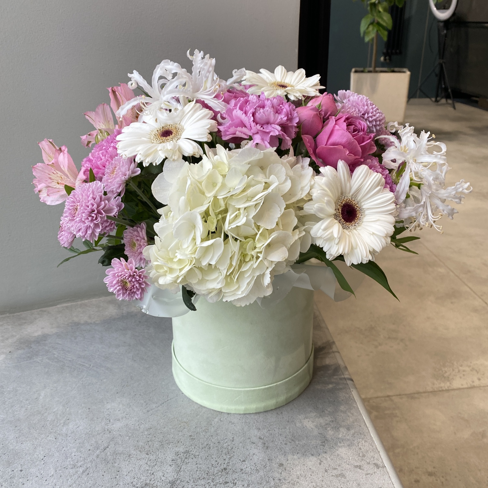 Состав: гвоздика 5, хризантема 3, гербера 3, гортензия 1, альстромерия 1, роза кустовая 1, хризантема кустовая 1, фисташка 0,3 и прочее. в наличии
