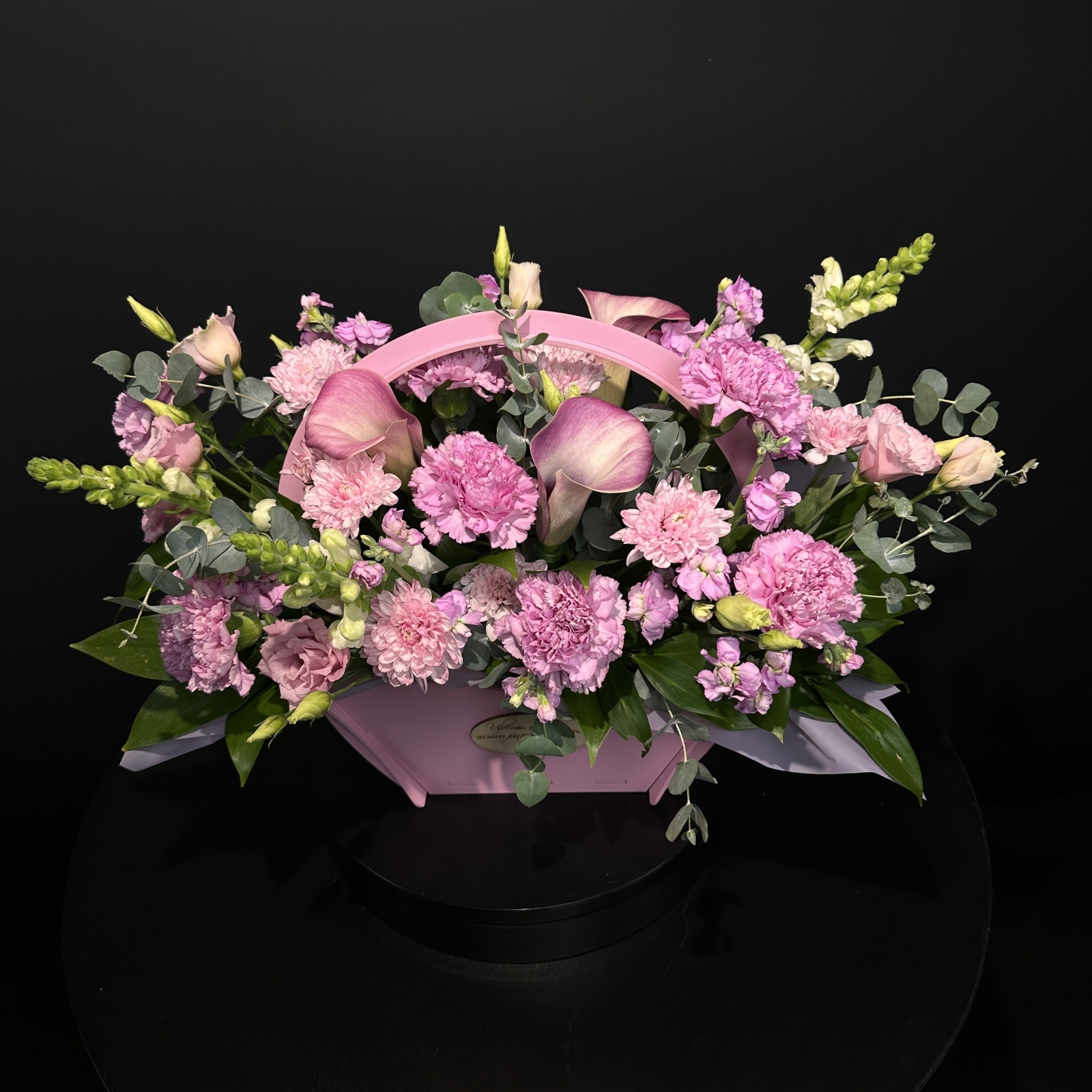 Состав: гвоздика 7, антирринум 3, роза 2, маттиола 2, лизиантус 1, рускус 0,2 и прочее.