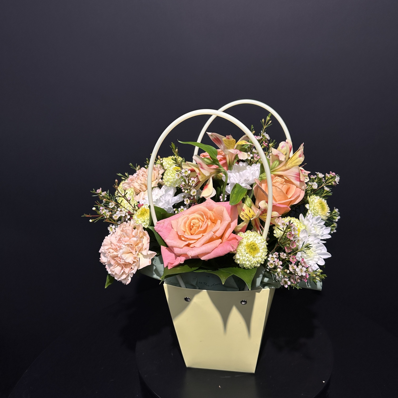 Состав: роза 3, гвоздика 2, хризантема кустовая 1,5, альстромерия 1, рускус 0,2 и прочее. под заказ