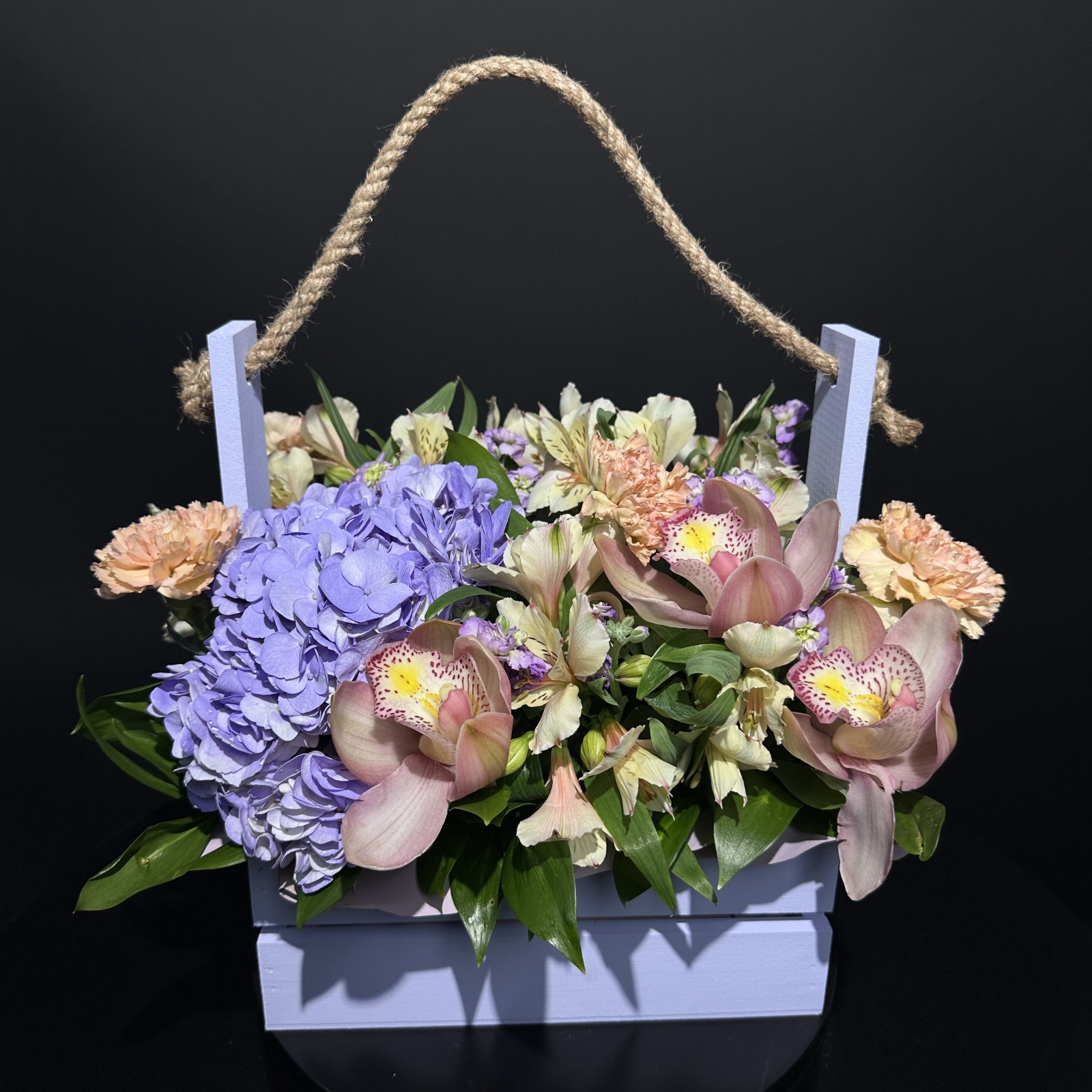 Состав: альстромерия 5, маттиола 4, гортензия 1, ветка цимбидиум 0,2 и прочее. под заказ