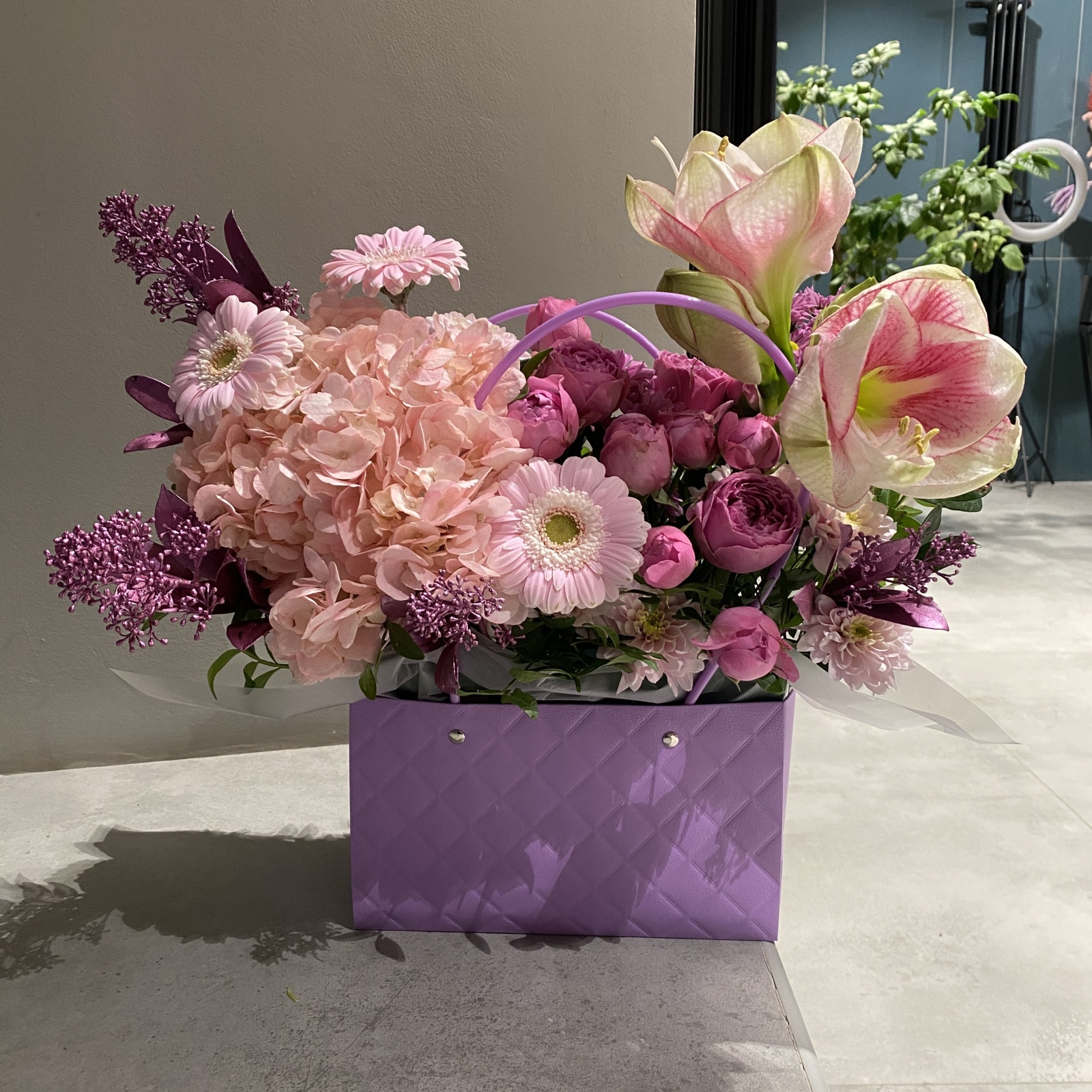 Состав: гербера 3, хризантема 2, роза кустовая 1, хризантема кустовая 1, гортензия 1, фисташка 0,2 и прочее.