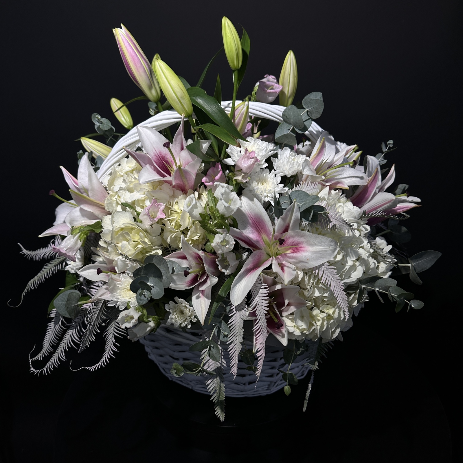 Состав: лилия 5, хризантема кустовая 4, гортензия 3, эвкалипт 3 и прочее. под заказ
