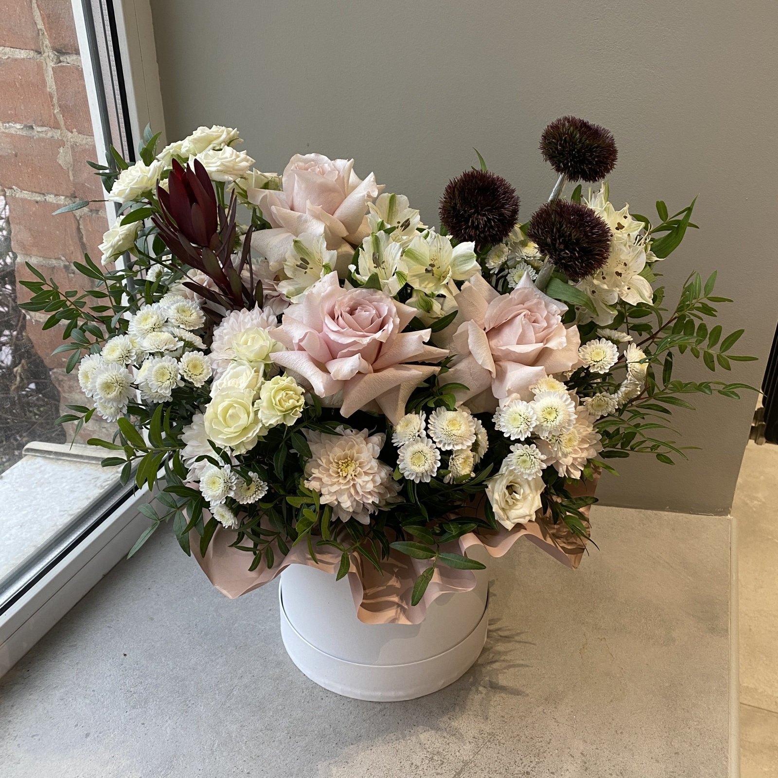Состав: роза 3, хризантема кустовая 3, гербера 3, альстромерия 2, роза кустовая 2, леукадендрон 1, фисташка 0,5, рускус 0,5 и прочее. под заказ