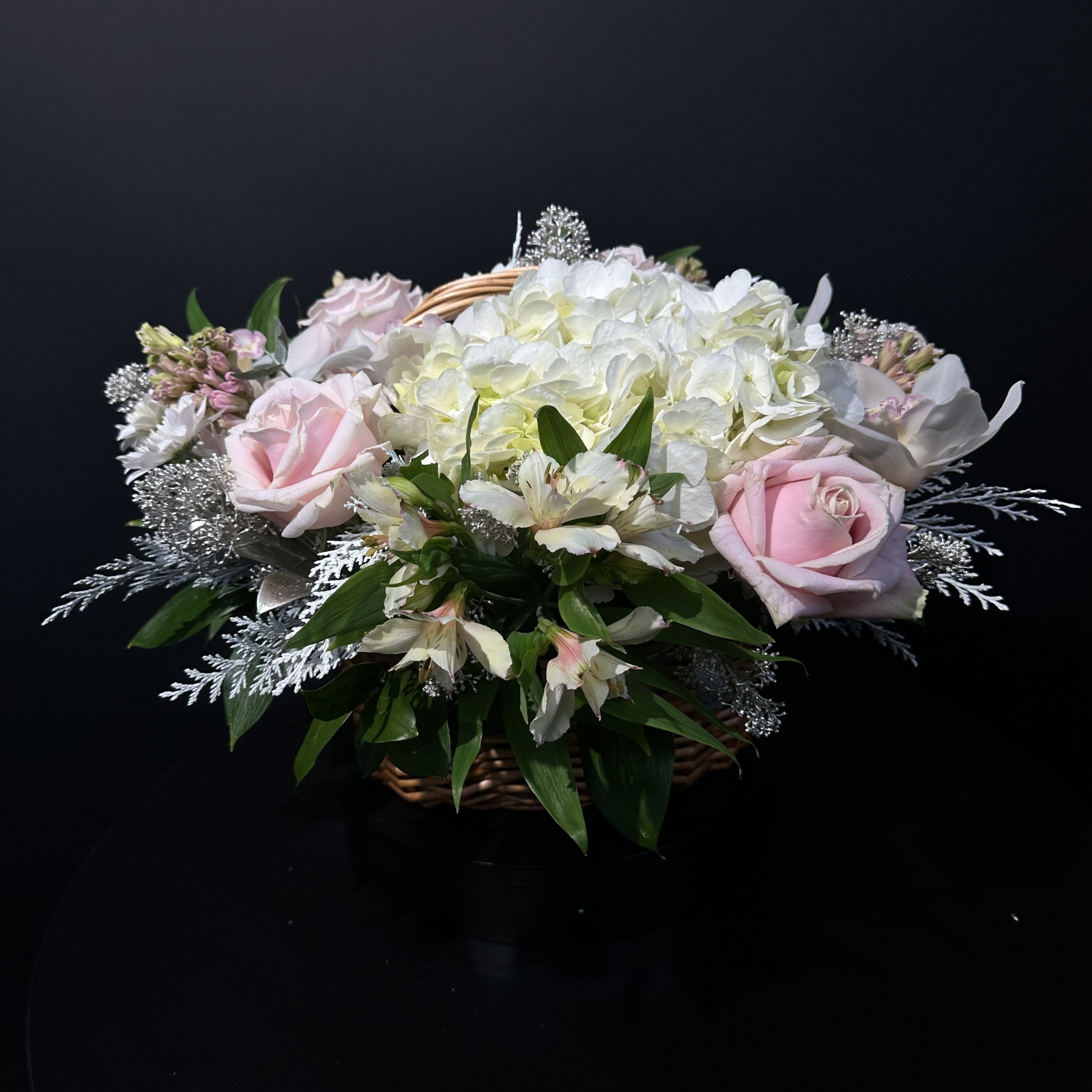 Состав: роза 4, гиацинт 3, гортензия 1, рускус 0,5, ветка цимбидиум 0,5 и прочее. под заказ