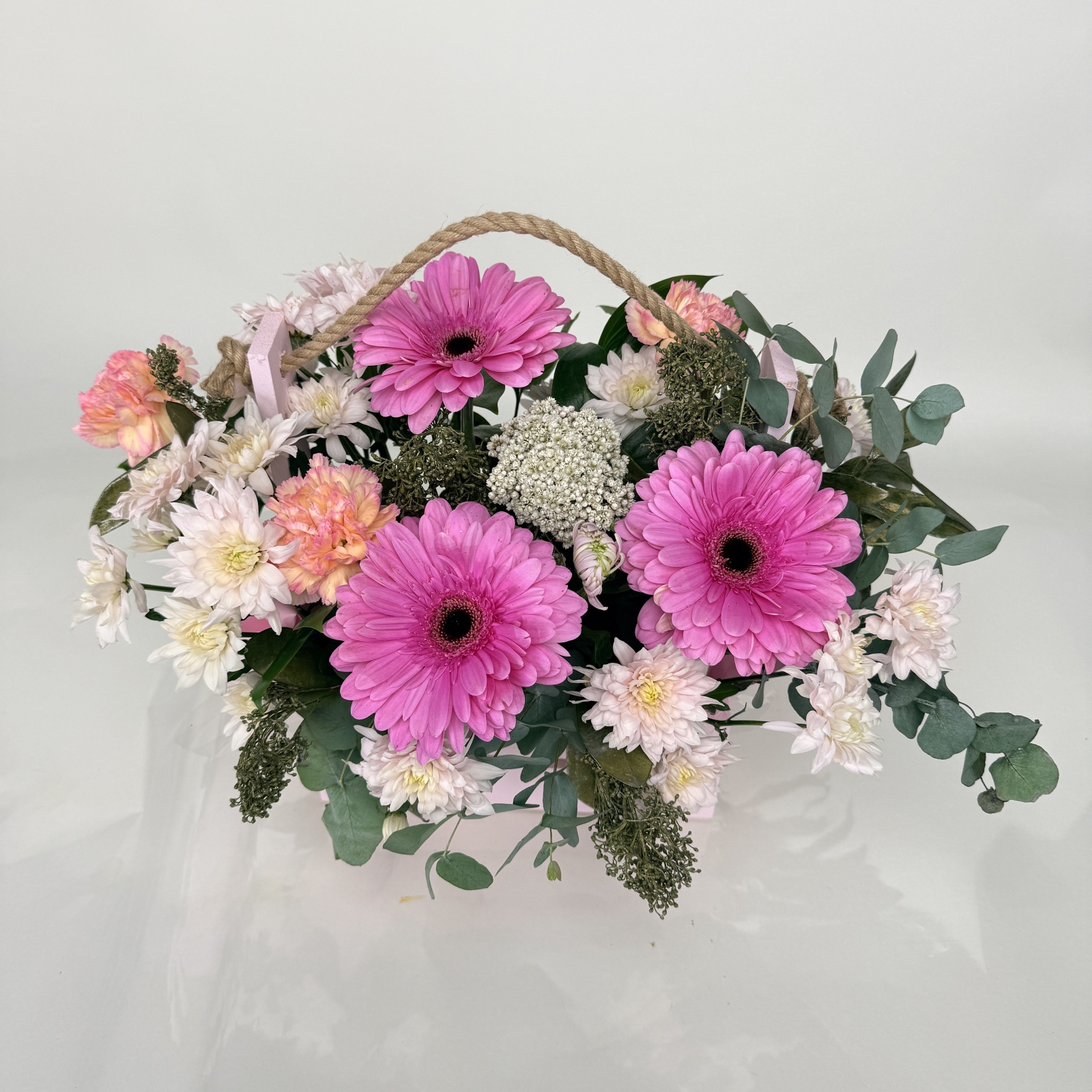 Состав: гербера 3, хризантема кустовая 2,5, гвоздика 2, эвкалипт 1, рускус 0,5 и прочее. под заказ