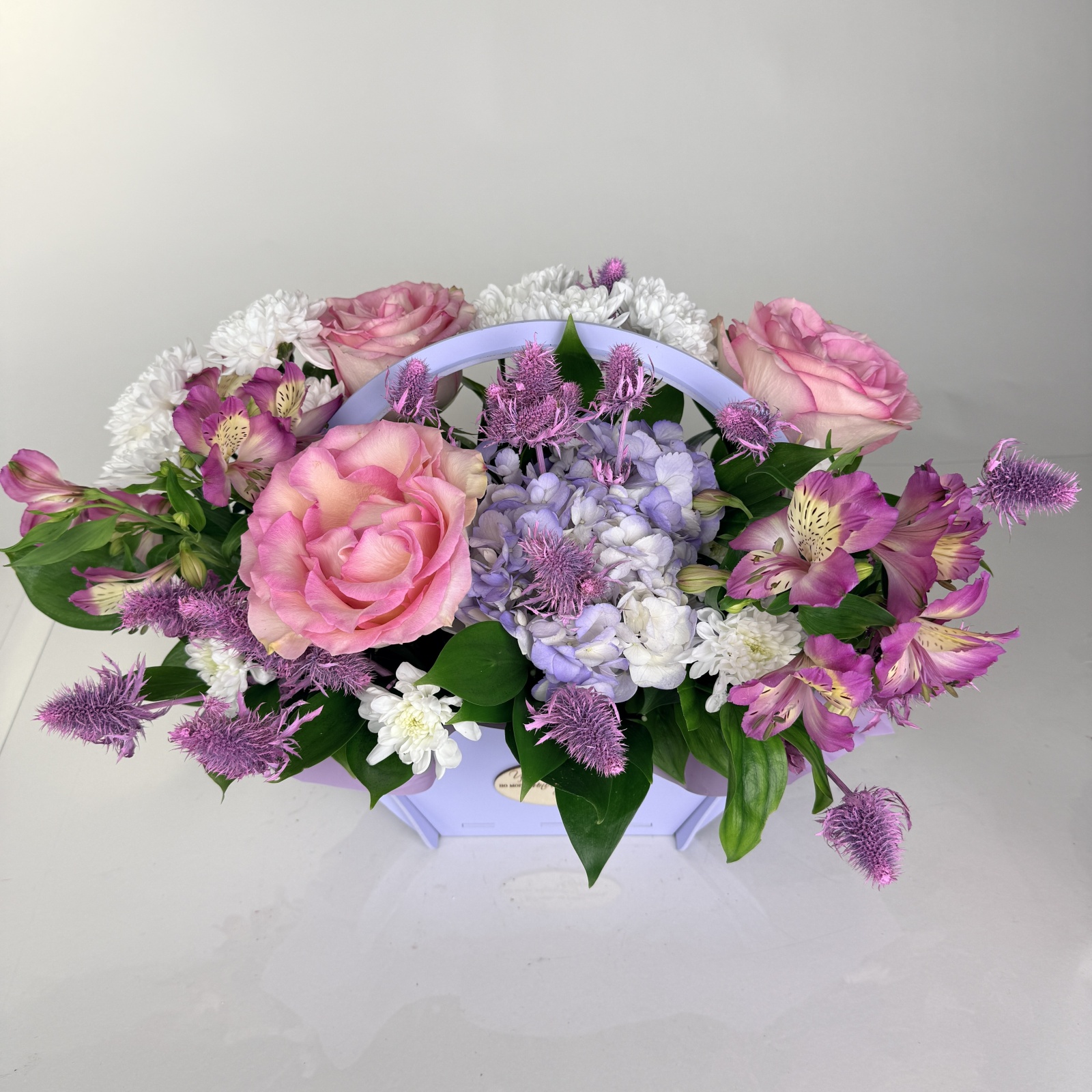Состав: роза 3, эрингиум 3, альстромерия 2, хризантема кустовая 2, гортензия 1 и прочее.