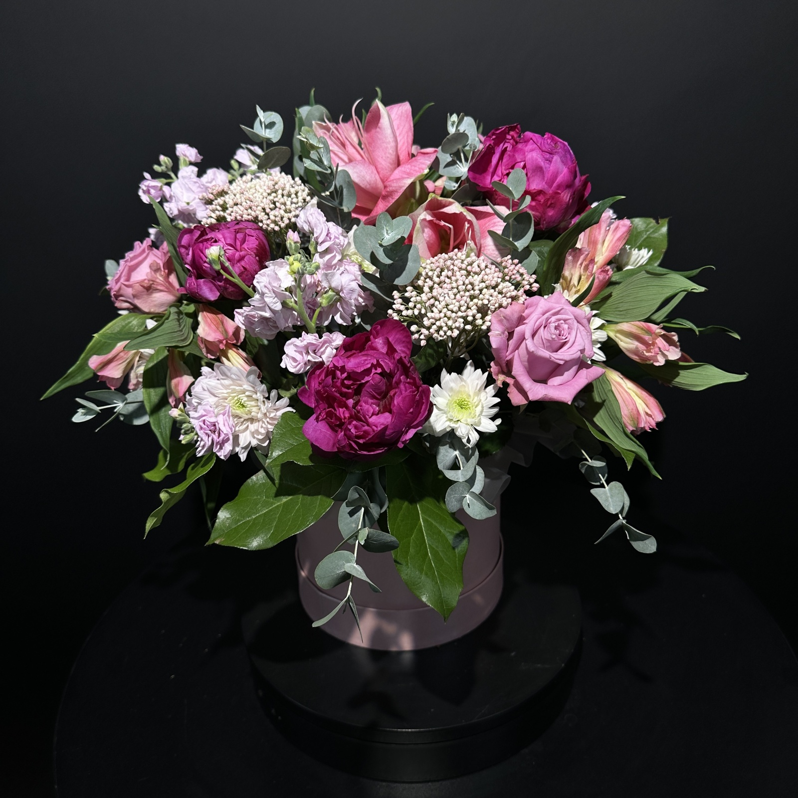 Состав: альстромерия 3, маттиола 3, пион 3, эвкалипт 3, роза 2, хризантема 1 и прочее. под заказ