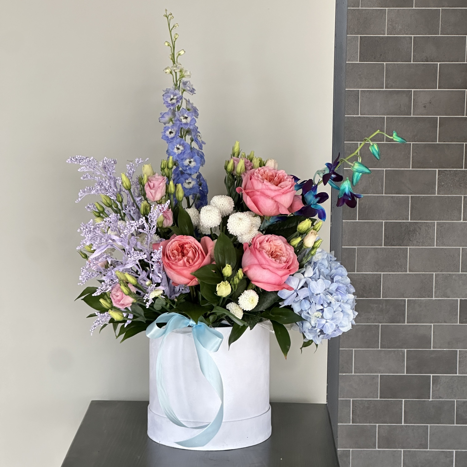 Состав: хризантема кустовая 3, лизиантус 2, солидаго 2, дельфиниум 1, дендробиум 1, гортензия 1, рускус 0,5 и прочее.