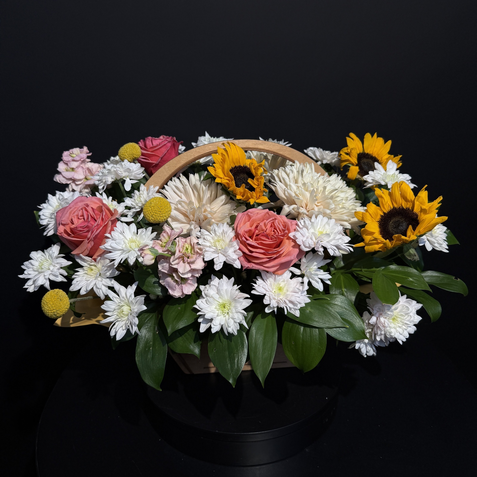 Состав: хризантема 3, роза 3, маттиола 2, роза кустовая 1, рускус 0,5 и прочее. под заказ
